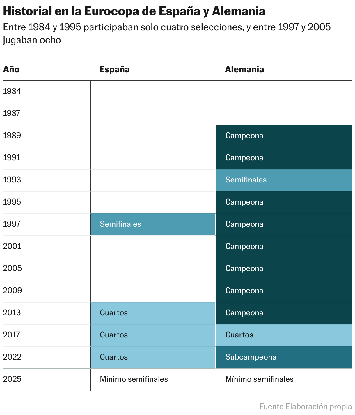 España juega este miércoles (21.00, La1) en Zúrich uno de los partidos más importantes de su historia. La selección que en 2023 se proclamó campeona del mundo en Sídney y un año más tarde levantó la Nations se enfrenta a Alemania, el dominador de la Eurocopa con ocho títulos, en las semifinales del torneo. Es la segunda vez, tras la de 1997, que la Roja llega al penúltimo escalón. Hace 28 años cayó contra Italia en un campeonato que solo jugaban ocho equipos y que ni siquiera se llamaba como ahora. Hoy, con un grupo de jugadoras completamente profesionales, la selección trata de romper su techo en una Euro contra un rival al que nunca ha ganado y pisar al fin la final. En contra de la historia, el combinado dirigido por Montse Tomé, que el pasado viernes superó por primera vez una eliminatoria en el torneo, es el favorito pese al currículum tan exitoso de la máquina alemana, campeona en 1989, 1991, 1995, 1997, 2001, 2005, 2009 y 2013 y subcampeona en 2022.