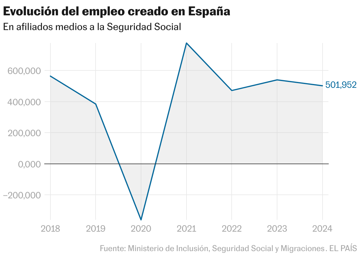 Que el empleo haya crecido algo menos en 2024 que en el año anterior no opaca el comportamiento sorprendentemente estable y positivo que el mercado laboral ha demostrado en los últimos años. Desde 2018 se han creado más de 2,8 millones de puestos de trabajo, y solo en 2020, un ejercicio anómalo e influenciado por la pandemia, se resintió el número de cotizantes a la Seguridad Social (-360.105).