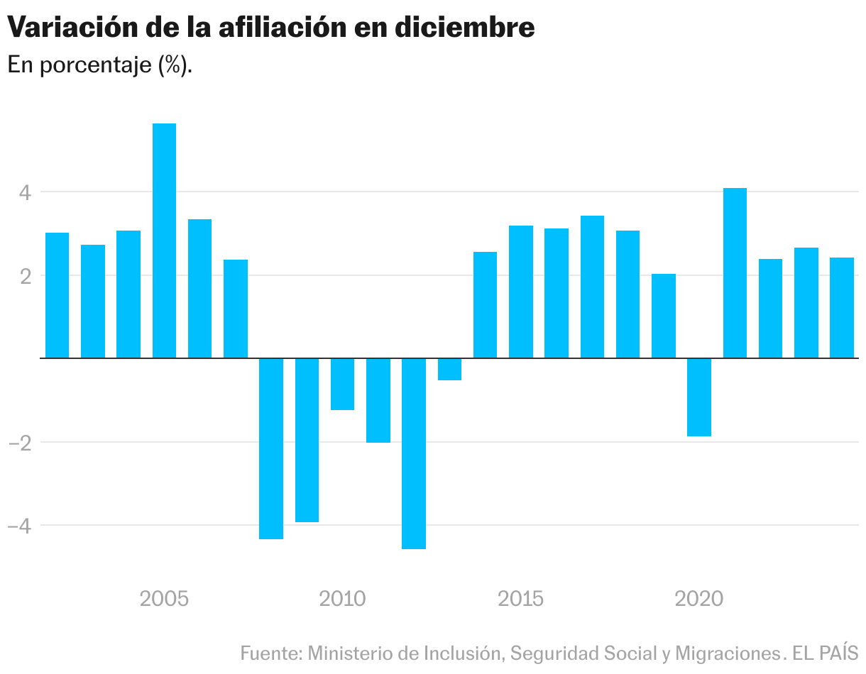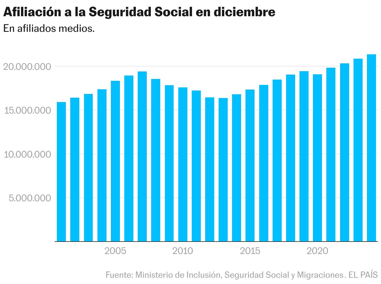 Sin embargo, la cima más celebrada que del mercado laboral en 2024 fue la consecución de los 21 millones de afiliados medios a la Seguridad Social que se certificó en abril, y que desde entonces se ha mantenido por encima de esa barrera psicológica, también en el último mes del curso. De hecho, los 35.500 empleos que se crearon en el último mes de 2024 han permitido que este sea el diciembre con mayor nivel de empleo desde 2001, y que, gracias a ellos, se computen 2,3 millones de afiliados nuevos en los últimos cuatro años.