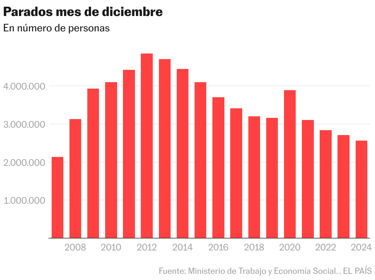 La otra estadística que difunden las autoridades españolas junto con la afiliación, el desempleo, también muestra una evolución positiva. El total de parados también se ha reducido en los últimos 12 meses, hasta situarse en 2.560.718 personas en el último capítulo del año, la cifra más baja en este periodo en 17 años.