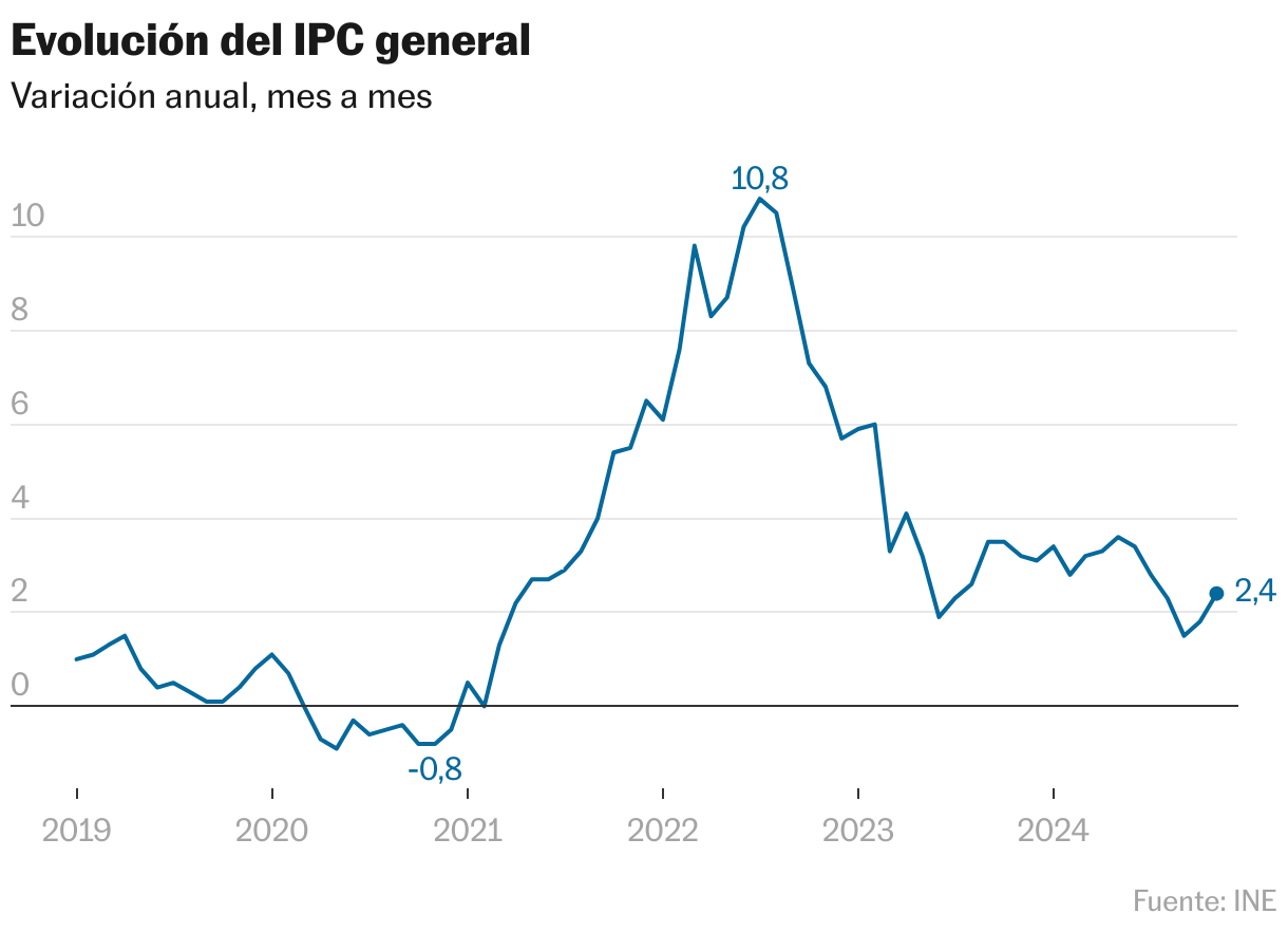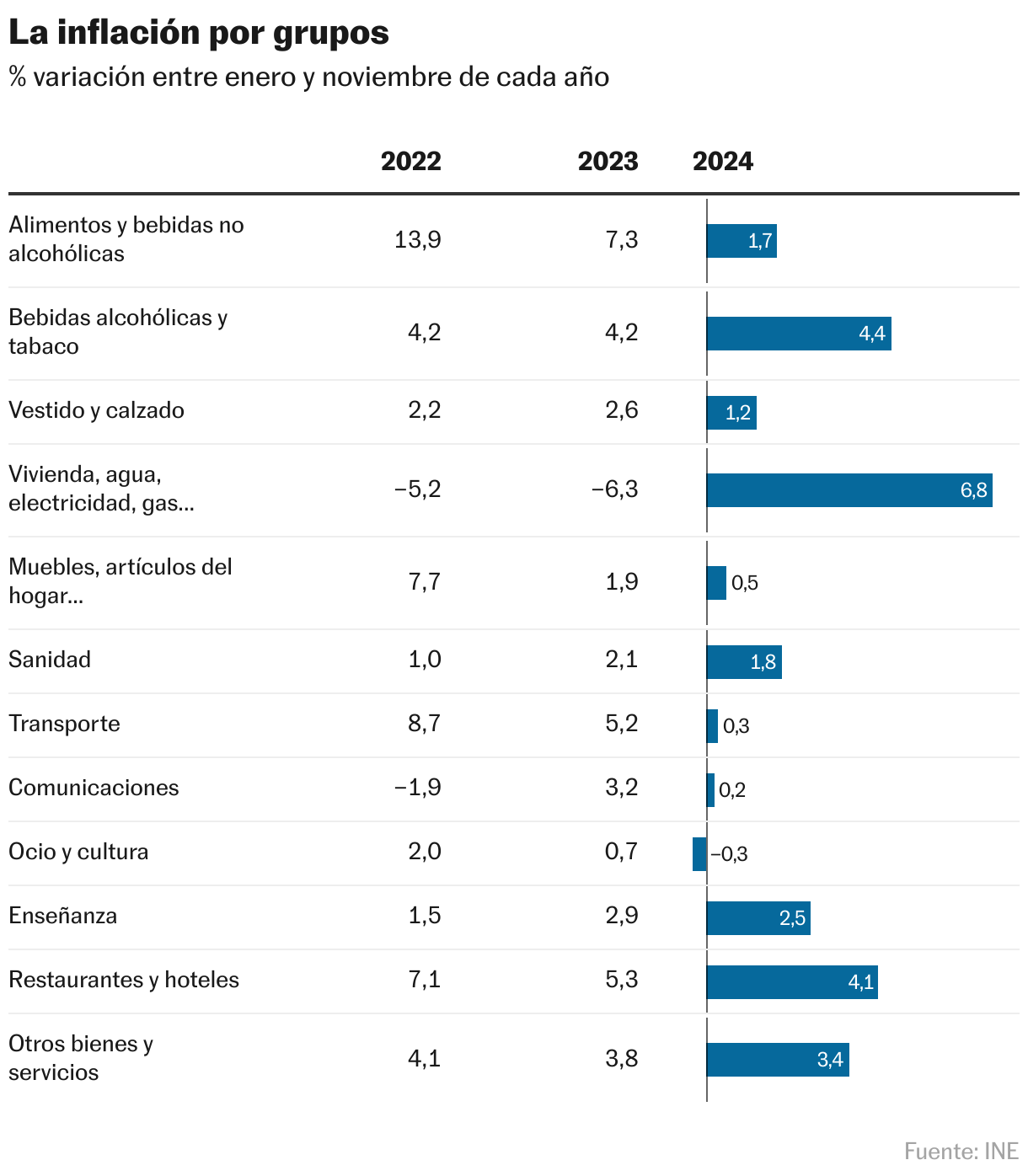“La inflación no es solo una cuestión de precios, es una cuestión de expectativas”. Las palabras de Paul Volcker, expresidente de la Reserva Federal de los Estados Unidos, resuenan en una época en la que el valor del dinero no se mide únicamente por lo que una persona puede comprar hoy, sino por la confianza en lo que podrá pagar mañana. En este contexto, 2024 será recordado como el año en que España logró domar la inflación, como otros países de su entorno, marcando un punto de inflexión tras años de turbulencia económica. El flagelo económico que azotó en 2022 y gran parte de 2023 ha mostrado signos definitivos de control durante este año. A falta de los datos de diciembre, cuyo avance se conocerá el lunes aunque no se tendrán detalles hasta mediados de enero, el Índice de Precios al Consumo (IPC) acumula una variación del 2,4% hasta noviembre, último mes con datos definitivos. Esto supone un retroceso significativo frente al 3,1% registrado a finales del año pasado. Más allá de las grandes cifras macro del Instituto Nacional de Estadística (INE), lo que sigue es un relato, organizado por grupos, de alegrías y algún que otro dolor de cabeza para las carteras.