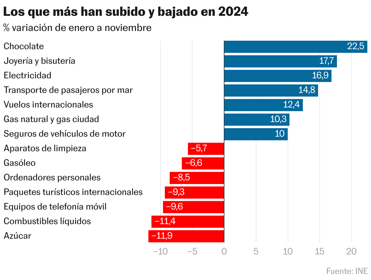 Azúcar, leche y yogur son algunos de los productos que más han bajado de precio. Mención aparte merece el aceite de oliva, que por fin empieza a abaratarse después de haberse convertido en un auténtico lujo en 2023, cuando repuntó más de un 50%. Aunque el balance general es positivo, hay alimentos que se han encarecido con fuerza respecto al año anterior. Ese es el caso de los zumos y las patatas, básicas en la dieta mediterránea, que hasta noviembre habían repuntado un 9,8% y un 7,9%, respectivamente. El chocolate ha escalado incluso más, hasta tasas superiores al 20%. Su encarecimiento se debe a la incapacidad de los países productores de cacao, como Costa de Marfil y Ghana, para satisfacer la demanda debido a condiciones climáticas adversas y plagas.