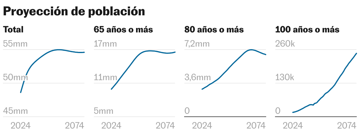 Dada la estructura poblacional actual, el porcentaje de personas con 65 y más años pasaría del 20,4% en 2024 a un máximo del 30,5% en torno a 2055. La subida también es elevada entre los octogenarios. Si en 2024 un 6% de la población ha cumplido ya los 80, en 2074 serán el 12,3%. Ya no será tan raro superar los 100. De aquí a 15 años la cifra prácticamente se triplicará; en 2074 se multiplicará por 14,5, hasta superar las 245.000 personas. “Cuanta más edad tiene la población, más servicios sanitarios requiere, más atención por dependencia, también están las pensiones… El Estado tendrá que prepararse para cada vez dedicar, en números absolutos y relativos, más presupuesto a estas poblaciones mayores”, advierte Esteve. Y prosigue Ramiro: “Tendremos una pirámide más envejecida, porque con una fecundidad [número de hijos por mujer] de 1,16, como la de 2022, o de 1,24 [como proyecta el INE para 2038], tendremos una media de edad bastante alta, que se compensa con la llegada de migrantes”.