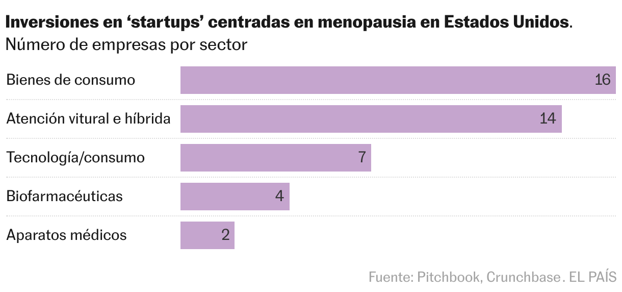 Entre 2015 y el primer trimestre de 2023, las firmas de capital riesgo apenas han invertido 530 millones de dólares en la creación de nuevas start-ups dedicadas a esta fase vital de la mujer (sobre todo en biofarmacia y atención clínica), según los datos de PitchBook y Crunchbase, que excluye a las empresas que ofrecen atención a la menopausia como parte de un conjunto de servicios. Sin embargo, el año pasado ya se notó un mayor apetito inversor. “Solo en 2023 la inversión de venture capital global en el espacio menopausia representó 230 millones de dólares, lo que significa un incremento del 22% respecto al año anterior”, expone el socio de Antai Ventures.