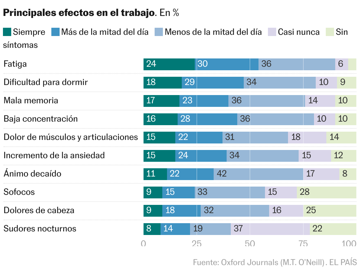 La mayoría de las investigaciones sugieren que algunas mujeres perciben que los síntomas de la menopausia tienen un impacto negativo en el trabajo. El estudio realizado por The Menopause Hub, la única clínica de Irlanda dedicada a esta cuestión, entre septiembre y octubre de 2023 y entre 3.044 mujeres, desvela que el 84% afirmó tener síntomas como la niebla cerebral, la pérdida de memoria, la fatiga, la sensación de agobio, la ansiedad y la pérdida de confianza que afectan negativamente a su rendimiento en el trabajo. El 37% dijo que había faltado a su puesto debido a los síntomas, y el 18% faltó más de tres días. El 77% no se sentía cómoda comunicando a su empleador la verdadera razón de su baja laboral. Un tercio de las mujeres se planteó dejar de trabajar y un 7% terminó renunciando. Siete de cada diez de las encuestadas dijeron querer formación sobre lo que supone esta etapa vital para todos los compañeros.