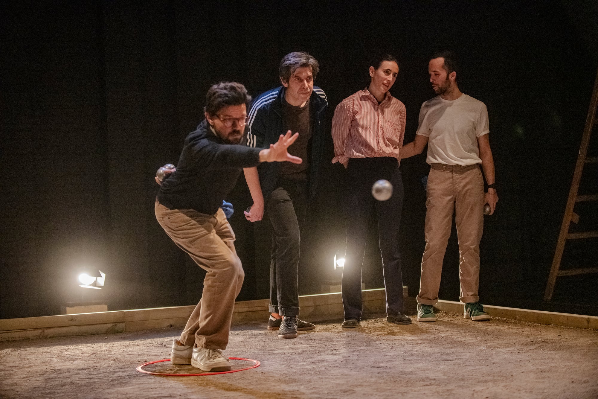 L’espectacle és una partida de petanca, i viceversa: els quatre membres de l’equip artístic són alhora els creadors i els jugadors de la peça. Ferran Dordal Lalueza al text i la direcció, Marc Salicrú a l’escenografia i la il·luminació, Clara Aguilar a la música i l’espai sonor, i Albert Pérez Hidalgo a la interpretació. A l’autor no li agrada el teatre de text, però ha escrit una obra amb molt de text: en escena es projectarà, es dirà en off (amb la veu assossegada d’Albert Prat) o el llegiran els mateixos intèrprets, que s’aniran passant el micròfon sense parar de jugar ni un moment. Aquí el més important és la petanca, no el text: són les jugades les que delimiten quin fragment llegeix cadascú. Cada funció, per tant, és diferent. Com passa amb la vida.