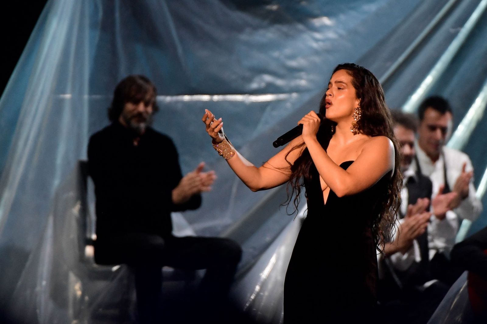Para la presentación que abrió la noche, una poderosa interpretación de «Se nos rompió el amor», Rosalía optó por un vestido más sobrio, con un escote profundo.