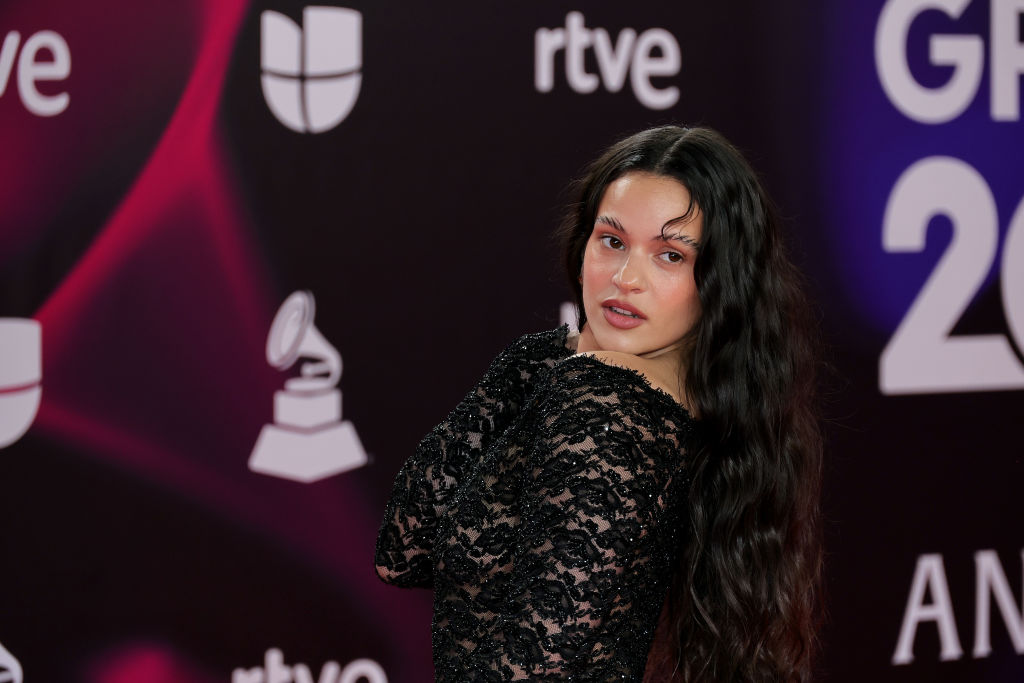 El negro fue el color elegido de Rosalía para esta gala de los Latin Grammy. En la alfombra roja lució un traje con transparencias y un atrevido look en sus cejas.
