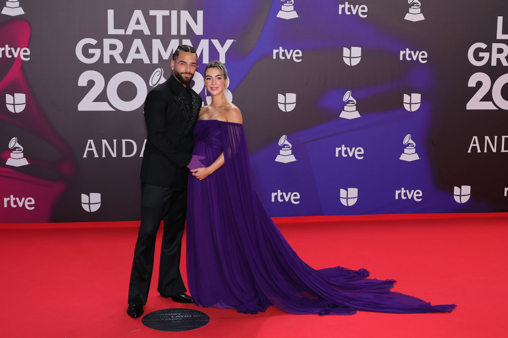 En la alfombra roja, Maluma posó con su pareja, Susana Gómez, que está embarazada. Ella lució un vestido violeta, y el artista un traje de solapas anchas con brillantes y guantes. Para su presentación junto a Carin León, el colombiano optó por un traje violeta