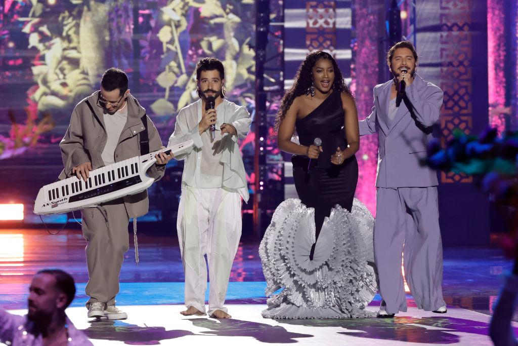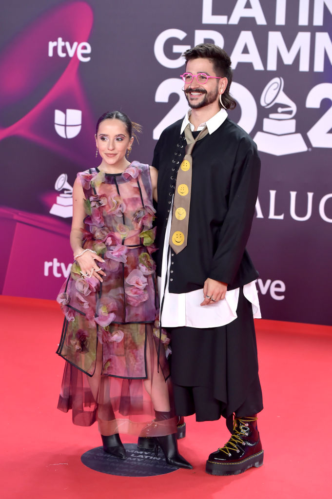 Camilo y su esposa Evaluna posaron en la alfombra roja con atuendos que no dejaron a nadie indiferente. Ella, con un vestido de páneles transparentes y botines, él, con una mezcla de corbata, camisa larga, falda y botas de cordones. Para su presentación con Edgar Barrera, IZA y Manuel Carrasco, Camilo lució pantalón amplio y ligero y una camisa transparente con una línea de botones asimétrica.