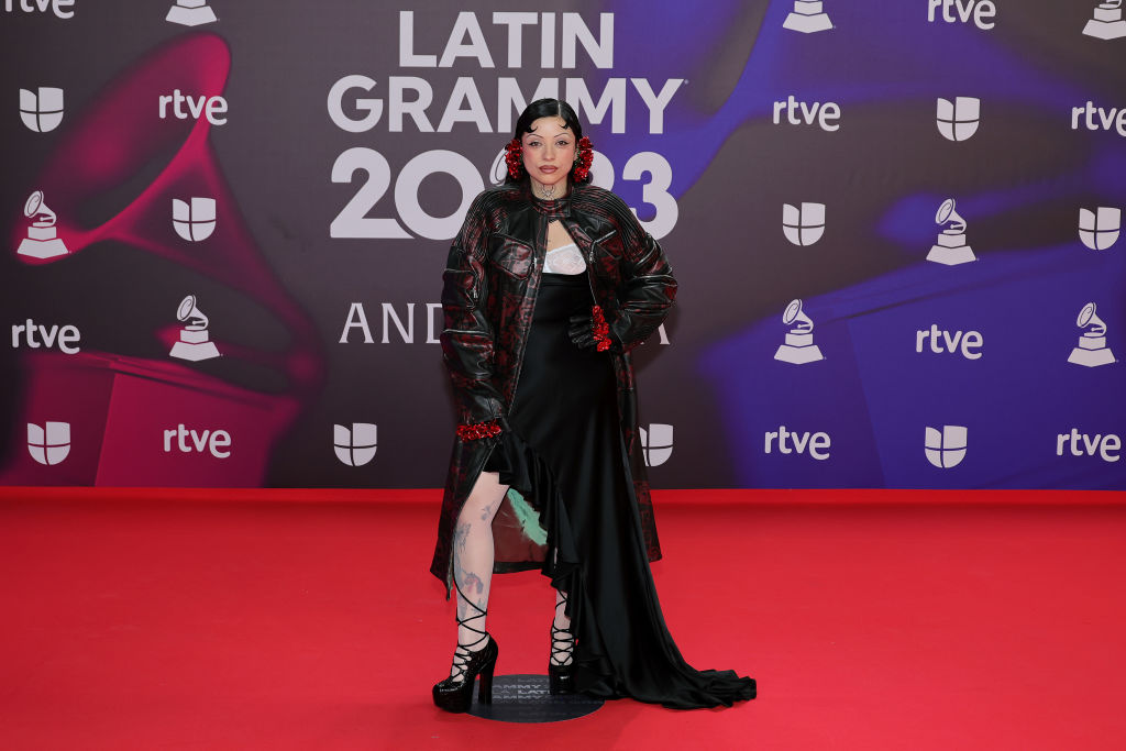 La artista chilenomexicana lució una mezcla de chaqueta de cuero, vestido negro con boleros y abertura en una pierna, cejas superdelgadas y un tocado de flores rojas.