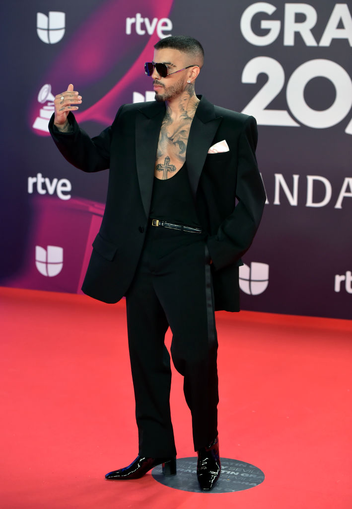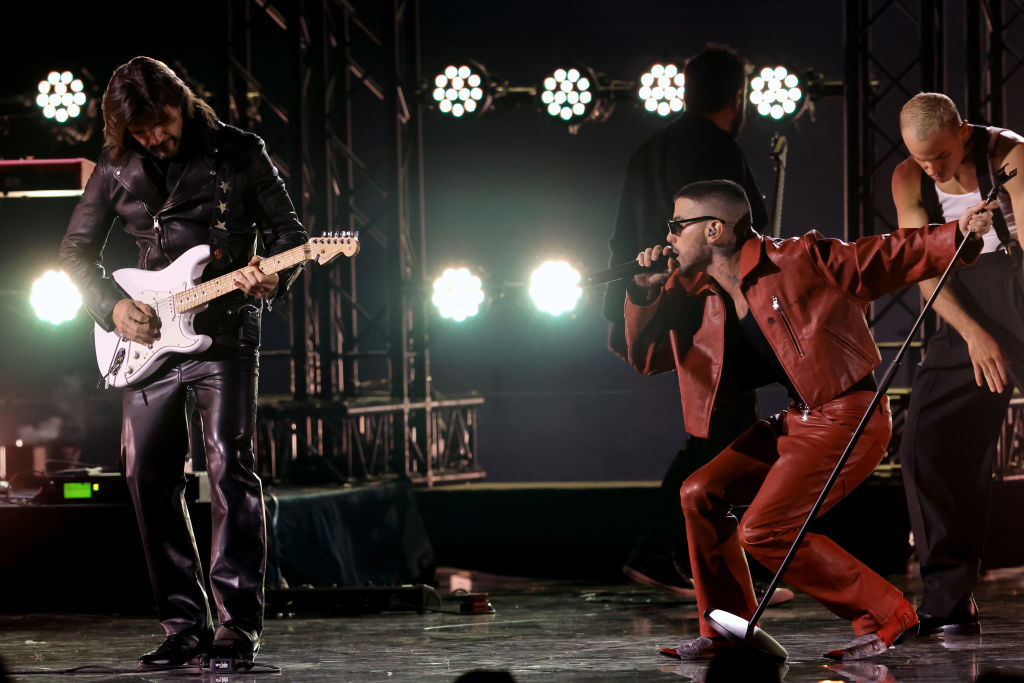 Rauw Alejandro vistió un esmoquin con un escote profundo en el pecho para la alfombra roja, y un conjunto de cuero para su presentación con Juanes.