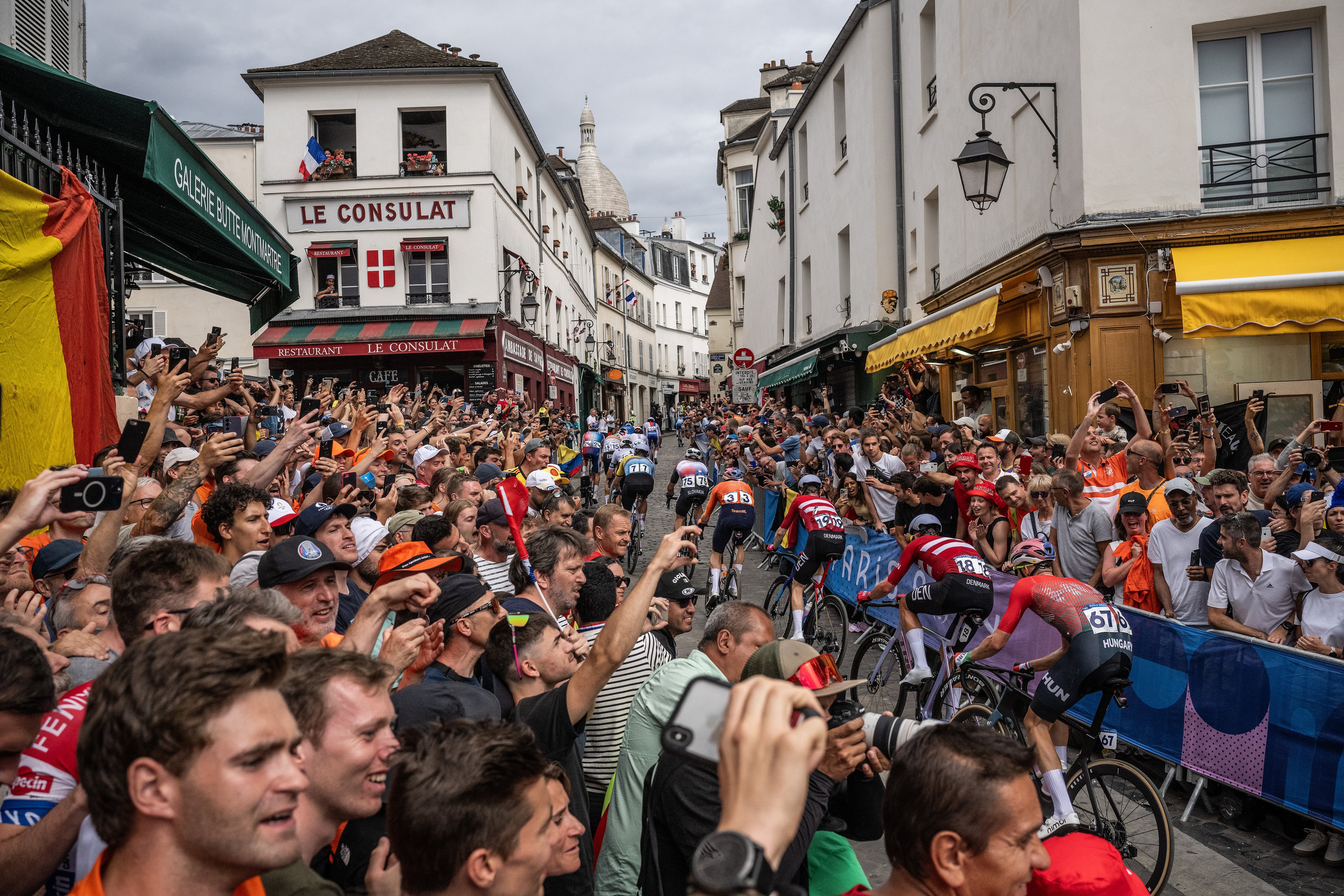 Pero hoy el peatón se ha acercado a Montmartre para seguir la prueba de ciclismo en ruta femenino, y lo que ve es lo contrario de la cólera, la indiferencia y la inquietud. Buen rollo y alegría. Una euforia que por momentos hace pensar: “Ni tanto ni tan poco”. Ya llegan. Por aquí suben las ciclistas, por la rue Lepic, “el río que irriga el país y lanza afluentes en el espesor del barrio”. Lo escribió, en los años treinta, Léon-Paul Fargue, autor de El peatón de París. Título inspirador.