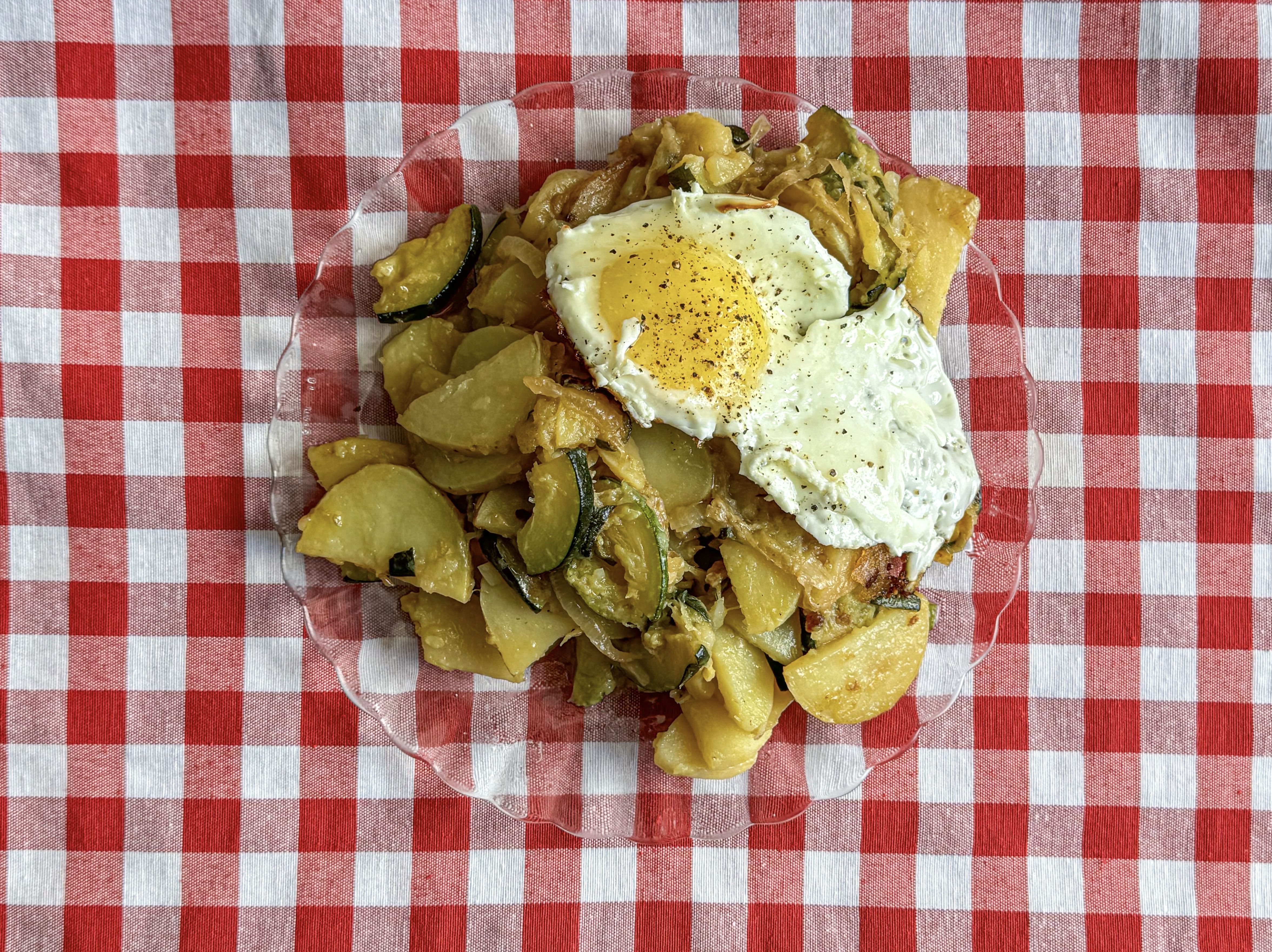 La clave de tan simple plato es prepararlo cuando hay calabacines y patatas nuevas de temporada. Parece una tontería –estamos demasiado acostumbrados a encontrar la misma verdura en cualquier momento del año–, pero un calabacín recién recolectado es una cosa maravillosa. Una vez en el fuego, se consigue ese toque caramelizado que aportan la paciencia y el remover con cuidado: al final, un huevo frito por encima, que nunca está de más.