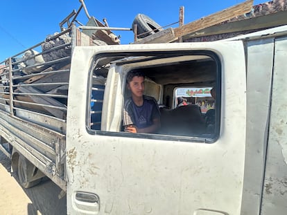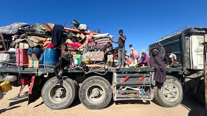 Mohammed al Dahdouh descarga las pertenencias de su familia, de 15 miembros, desde la parte trasera de un camión en la arena de la playa de Jan Yunis. Con movimientos bruscos, este barbero palestino de 38 años y padre de cinco niños lanza colchones, mantas, bolsas de ropa y enseres domésticos al suelo, en un gesto que refleja más rabia que cuidado hacia unas posesiones que representan los restos de su vida anterior en el barrio de Tel al Hawa, en Ciudad de Gaza. “Dios nos basta”, repite una y otra vez, con una voz que resuena en la playa, donde otros miles de familias desplazadas intentan levantar refugios improvisados tras no haber conseguido ni siquiera un pequeño terreno para instalar su tienda. “Por favor, cálmate. Por los niños, te necesitan”, le suplica su esposa, Mariam, de 35 años, que se sienta en la arena y abraza a su hija menor, Mais, de seis.