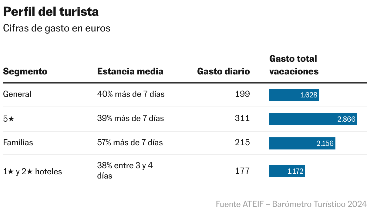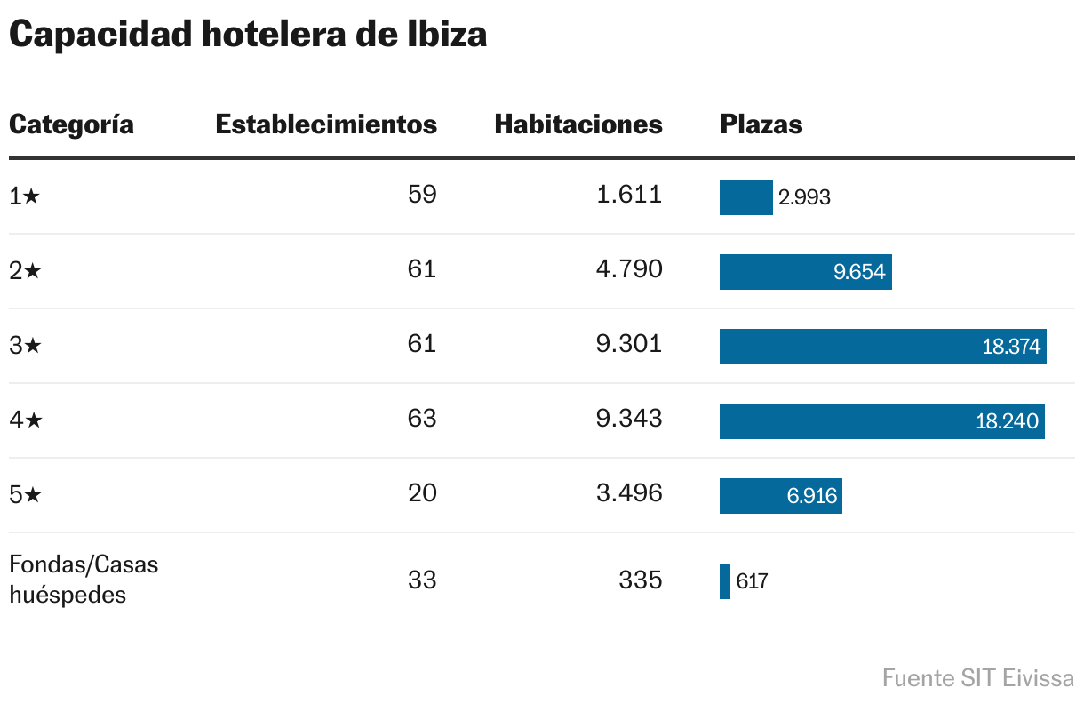 Los datos del SIT Eivissa no le dan la razón: el gasto medio del turista alojado en un hotel de 5 estrellas es de 311 euros diarios; en los de tres y cuatro estrellas, de 215; en los de una o dos, 177 euros. Sin embargo, en la escala macro, ricos hay menos, y el turismo asequible es el que mantiene al sector (que en temporada contrata de forma directa al 40% de los residentes). “Se habla mucho del lujo, pero está muy focalizado, de alrededor de 500 alojamientos, solo 20 son hoteles de cinco estrellas, el grueso son los de tres y cuatro”, dice el director de Turismo. “El lujo es una parte pequeña del negocio, aunque por ello mismo tiene más potencial de crecimiento”.