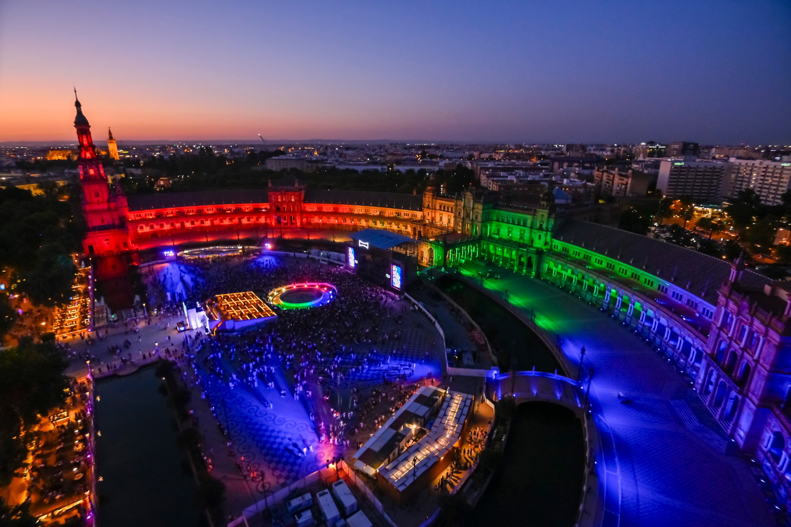 En España hay varios emplazamientos denominados como bien de interés cultural (BIC) que cuentan desde hace años con una destacada programación cultural. Es el caso del teatro romano de Mérida o el teatro Grec de Barcelona. En Madrid, la puerta de Alcalá ha sido el alzado histórico para acciones especiales para música y entretenimiento (en 2024 el cantante Camilo ofreció un concierto con motivo del Día de la Hispanidad). Ahora es Sevilla y su plaza de España —proyectada por el hispalense Aníbal González— la ciudad que desea reivindicar la visibilidad de su arquitectura mediante la celebración del Icónica Santalucía Sevilla Fest (que tiene lugar en los meses de verano). Lo hace de la mano del experto en conservación y restauración de patrimonio Ángel Luis García Pérez, quien ha elaborado un protocolo propio de actuación para la implantación técnica del festival.