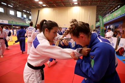 Hay imágenes boxísticas eternas a las que la púgil asturiana no renuncia. No puede hacerlo. Son la esencia del ring. Una es la estampa de los boxeadores perfilada en los carteles que anuncian los combates, en guardia, un puño adelantado, una pierna atrasada, agachados, preparados para golpear. Así quiere posar, histórica, tradicional, en uno de los cuadriláteros del gimnasio instalado en los sótanos del Consejo Superior de Deportes. En el rincón, una banqueta y un gigantesco embudo conectado con un tubo a un cubo en el suelo, para escupir saliva y malos pensamientos. “En el cole no me castigaban mucho, la verdad. No me mandaban apenas al rincón a pensar…”, dice. “Y ahora voy mucho. En el rincón lo que te ayuda es escuchar a tu entrenador, que te digan las cosas que tienes que hacer para mejorar, que te digan cómo vas, que te digan qué es lo que estás haciendo bien”.