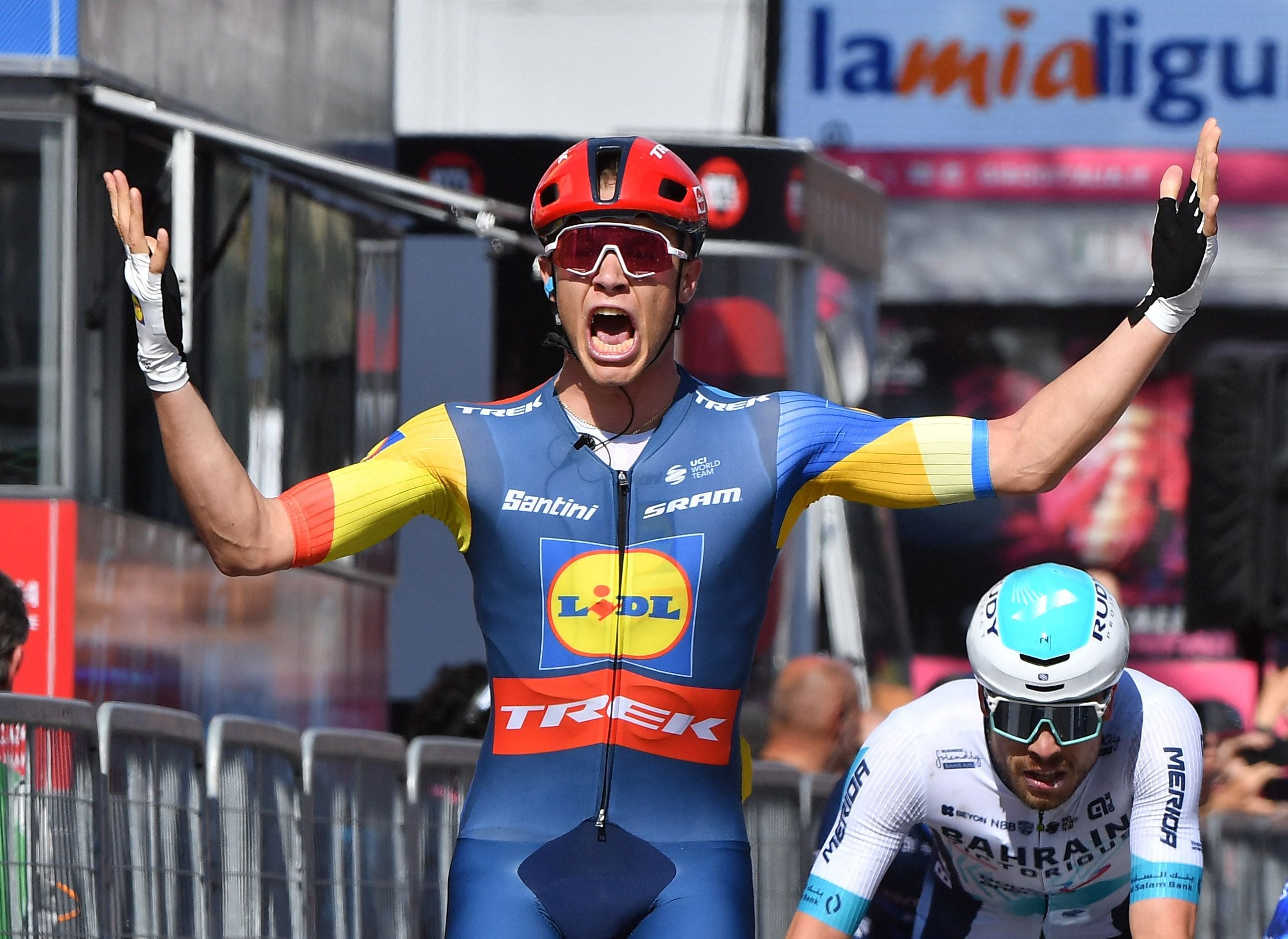 Por la Vía Aurelia, ascendiendo hacia el santuario de Nostra Signora delle Penne y el faro de Capo Mele, atravesando galerías que sujetan la montaña, es Filippo Ganna el que intenta dar la sorpresa; pasa en cabeza por el punto más alto y trata de mantener la diferencia en el descenso. Sorpresa, el líder se contiene. Durante un kilómetro, el italiano del Ineos mantiene la ilusión de ganar en la meta de Andora, pero se rinde a la evidencia de los velocistas, y entre ellos, es un compatriota, Jonathan Milan, del Lidl, quien, en un esfuerzo agónico, a base de brutales pedaladas en los últimos cien metros, es el que vence y se viste con la maglia ciclamino. Pogacar sigue de rosa.
