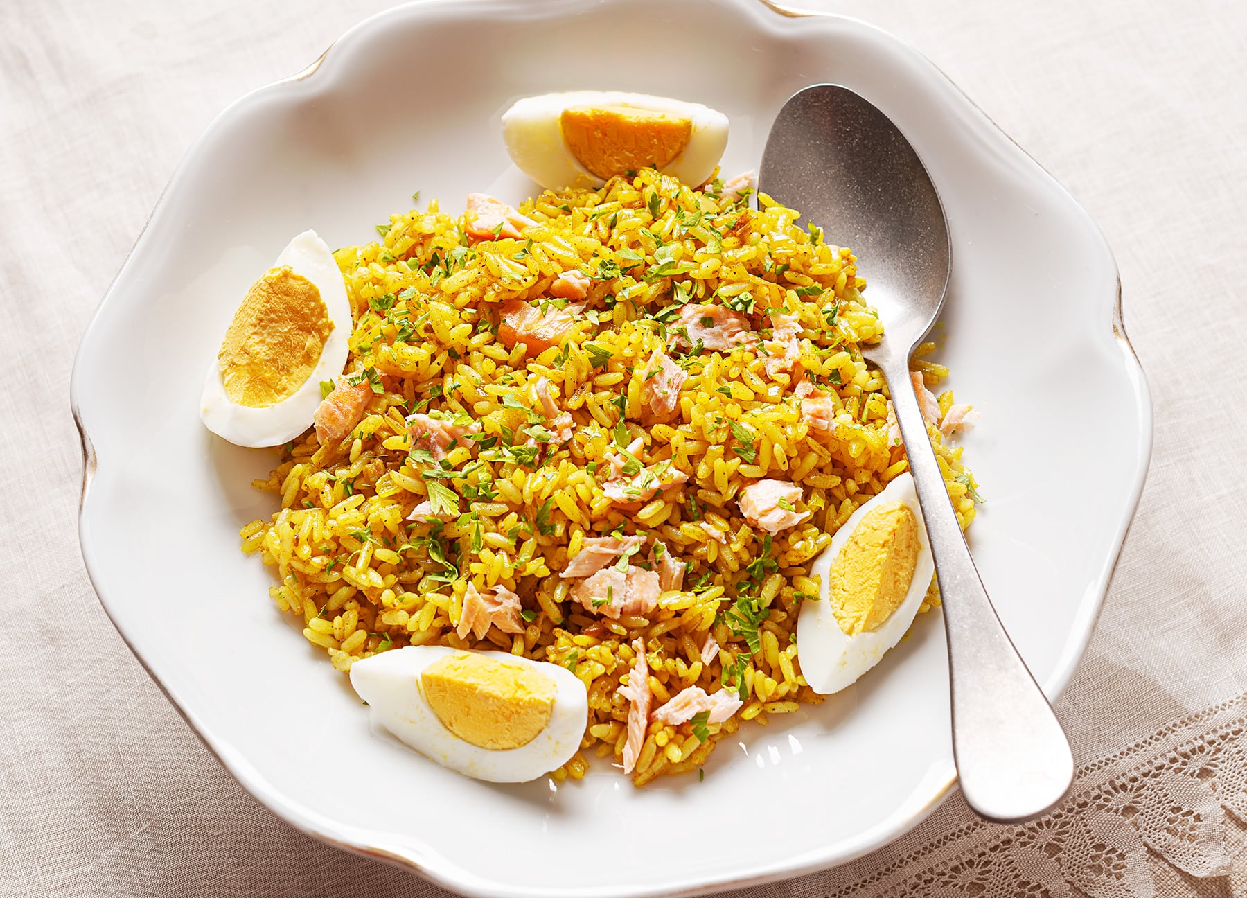 El kedgeree es un plato procedente de la India colonial que fue plenamente adoptado en la metrópoli, léase el Reino Unido. La versión más clásica del kedgeree –que se pronuncia así– lleva abadejo ahumado desmenuzado; el muy inglés smoked haddock, arroz hervido, huevo duro y cebolla, y se sazona profusamente con curry en polvo y perejil fresco.