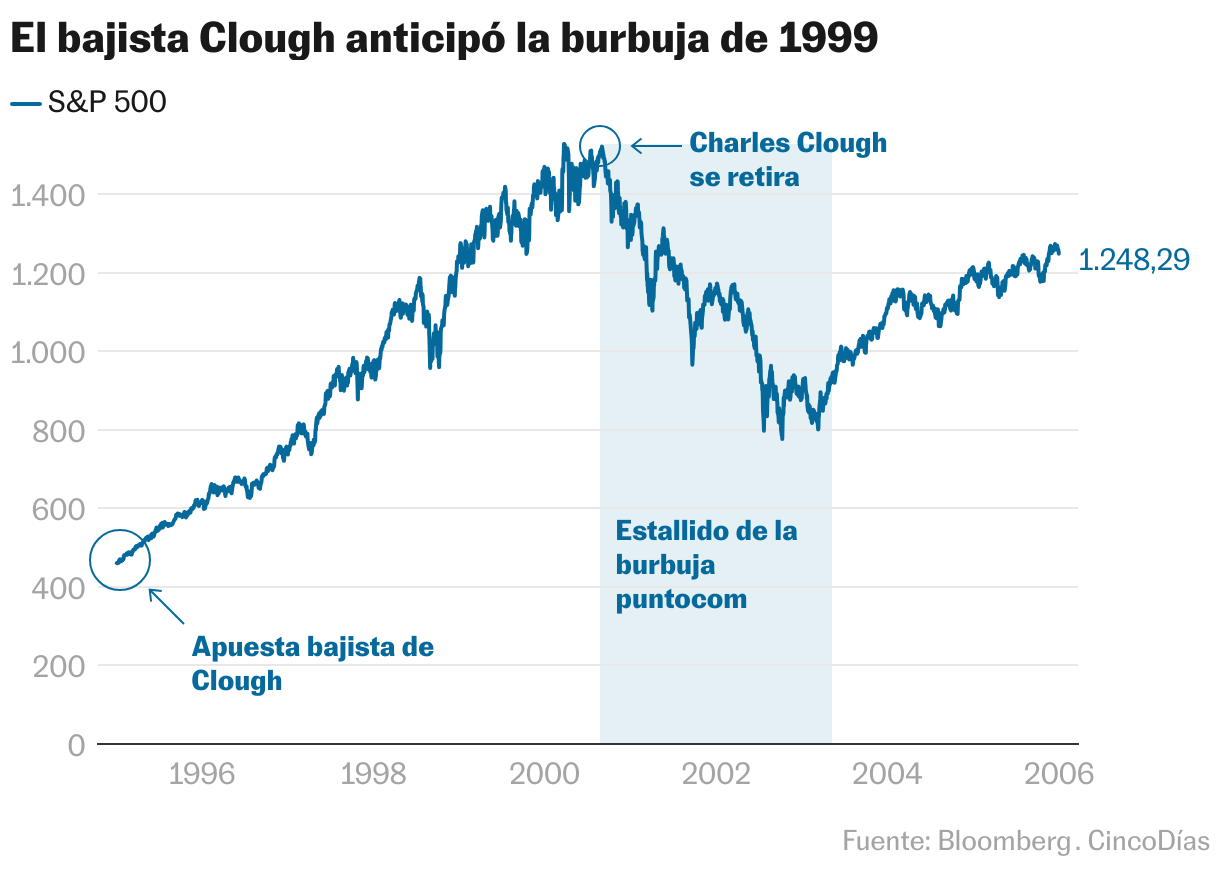 El caso de Kolanovic ha recordado a la retirada del mítico bajista de Merrill Lynch, Charles Clough, que dejó atrás su carrera financiera a escasos días del estallido de la burbuja puntocom en el verano de 1999. Clough llevaba cuatro años apostando en contra del S&P 500, que aprovechaba de un rally de 220% al calor del auge del internet.
