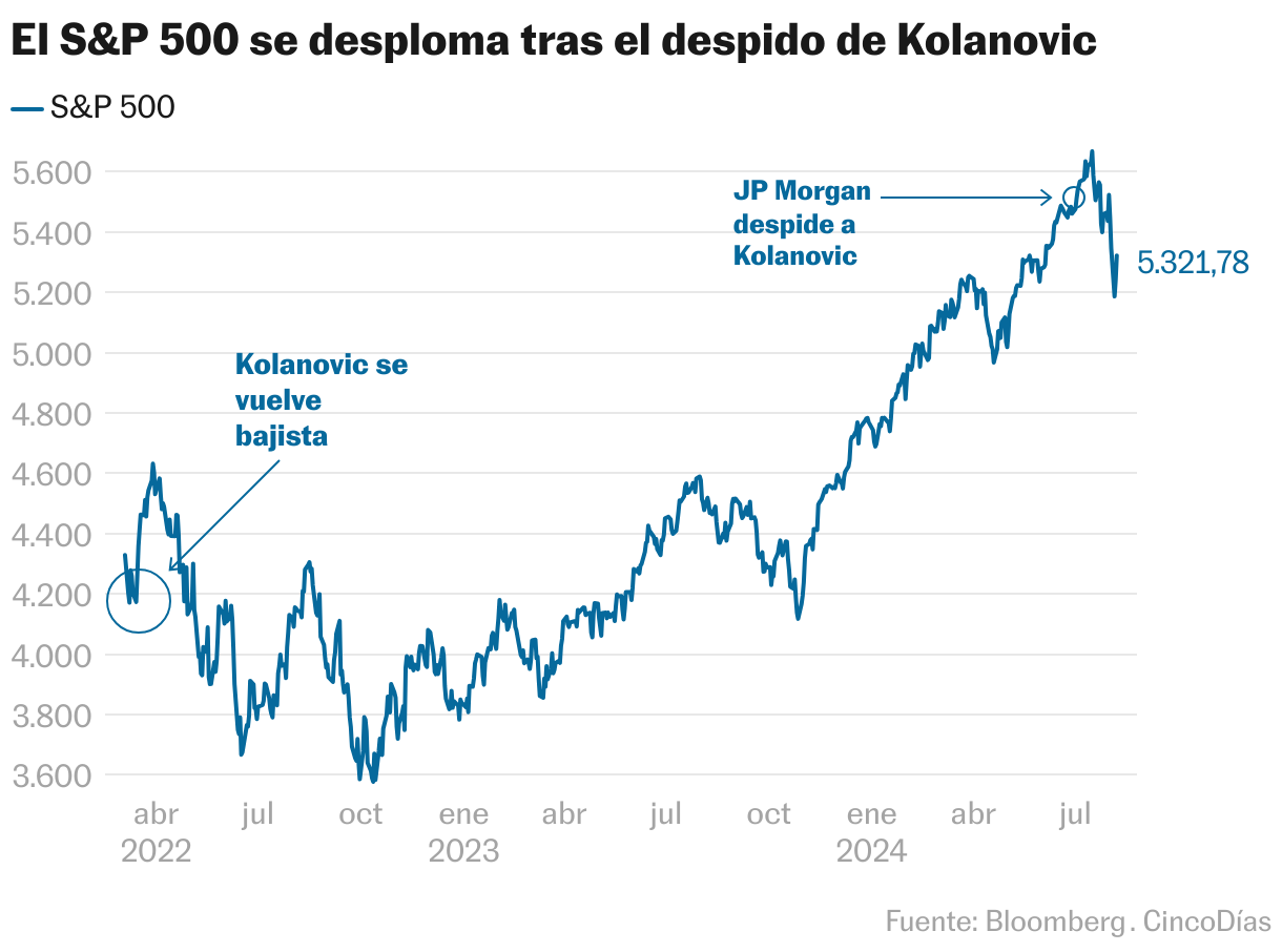 El último baile de Marko Kolanovic como el más bajista de los bajistas de Wall Street le costó su trabajo: llevaba desde septiembre del año pasado—incluso antes de la escalada astronómica del S&P 500 en un 25,5%— advirtiendo de una fuerte caída den el índice para finales de 2024. Es más, alertaba de una recesión inminente en Estados Unidos. El mensaje del ex jefe de estrategia global para JP Morgan era un presagio del ‘lunes negro’ que salpicó a las Bolsas en cada rincón del mundo esta semana, cuando el mismo índice perdió casi 400 puntos a lo largo del pánico desencadenado el pasado viernes.