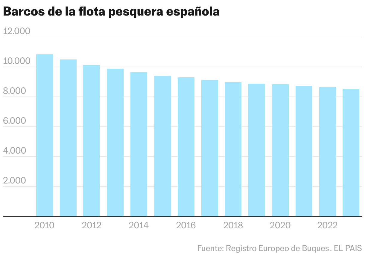 Desde que España entró en la UE y asumió la Política Pesquera Común (PPC), la flota ha descendido sin remedio: en 2008 había 13.000 buques censados y este año la cifra es de 8.657. Esos barcos llenan sus bodegas con unas 800.000 toneladas de peces, crustáceos y moluscos, de los cuales, cerca de 600.000 proceden de aguas reguladas por la Unión Europea. La primera venta de esos productos genera unos 2.000 millones de euros, según la estadística del Ministerio de Agricultura y Pesca. Pero estos peces no son suficientes para atender a un consumo interno que, aunque desciende de forma alarmante, supera en casi 70.000 toneladas la oferta (entre 2019 y 2023 cae un 16%, hasta los 18 kilos per cápita actuales). Como resultado, España compra fuera productos del mar por valor de 6.900 millones (datos de 2023), frente a unas exportaciones que no llegan a 4.000 millones, lo que arroja un saldo negativo que ascendió el año pasado a 2.960 millones.