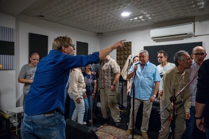 Vuelven a empezar. “¡No, no, no!”, los frena Montero. Da indicaciones. Alguno se ha adelantado. “Al turrón”, sentencia. Comienzan desde arriba. “¡Bailamos!”, los anima en el instrumental. El director se mueve por toda la sala esquivando cables y amplificadores mientras hace señas a los que les toca cantar. Luis Pérez, de 57 años, lleva un polo rosa y una sonrisa que no se le borra en toda la mañana. Aclara que “de nervios, nada”, porque ha estudiado un montón. Antes de retirarse, trabajaba en una cadena de montaje en un centro especial de empleo, con puestos de trabajo adaptados.