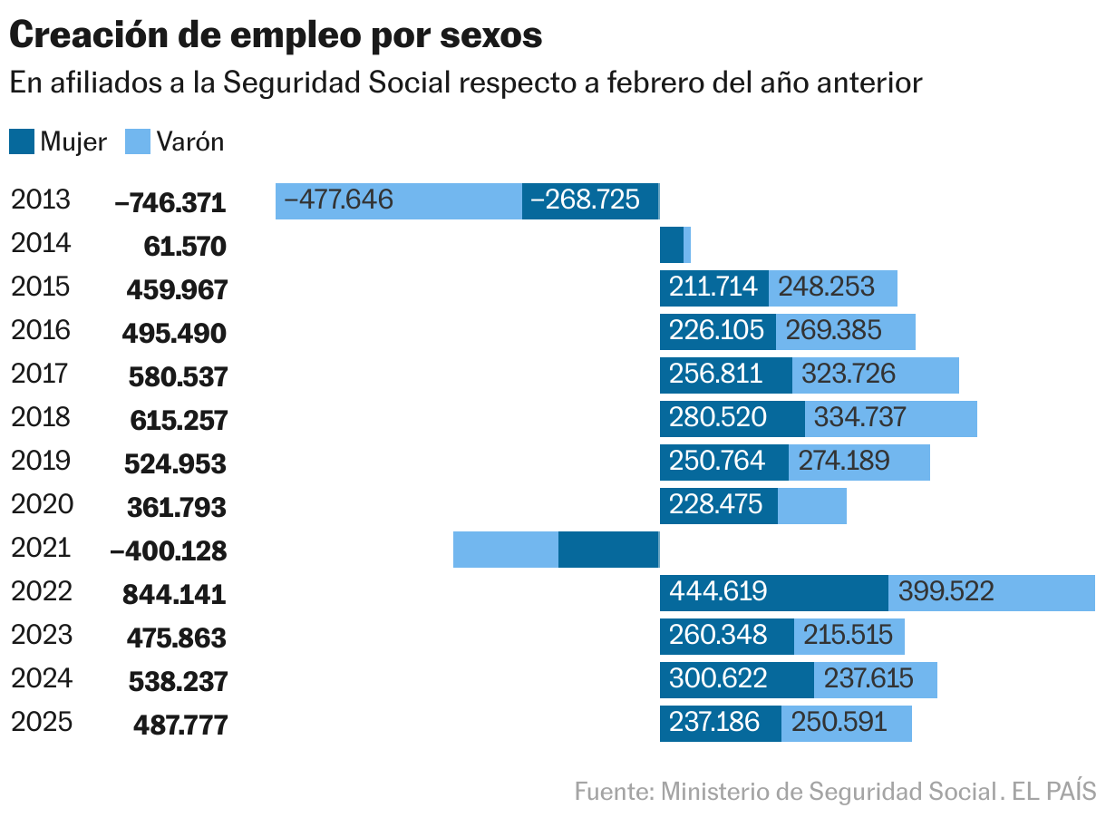 Es una diferencia sustancial respecto al año anterior, cuando se crearon 300.622 puestos de mujeres y 237.615 de hombres. Es decir, ellas aportaron el 56% de los nuevos empleos y ellos el 44%. La proporción era muy parecida en el ejercicio previo: de febrero de 2022 a febrero de 2023 se crearon 215.515 empleos de hombres y 260.348 de mujeres (ellas representaron el 55%). De febrero de 2020, el año de la crisis sanitaria, al mismo mes de 2021 se destruyeron unos 400.000 puestos, con una ligera mayoría de hombres. Es decir, hubo más varones que perdieron el empleo que mujeres.