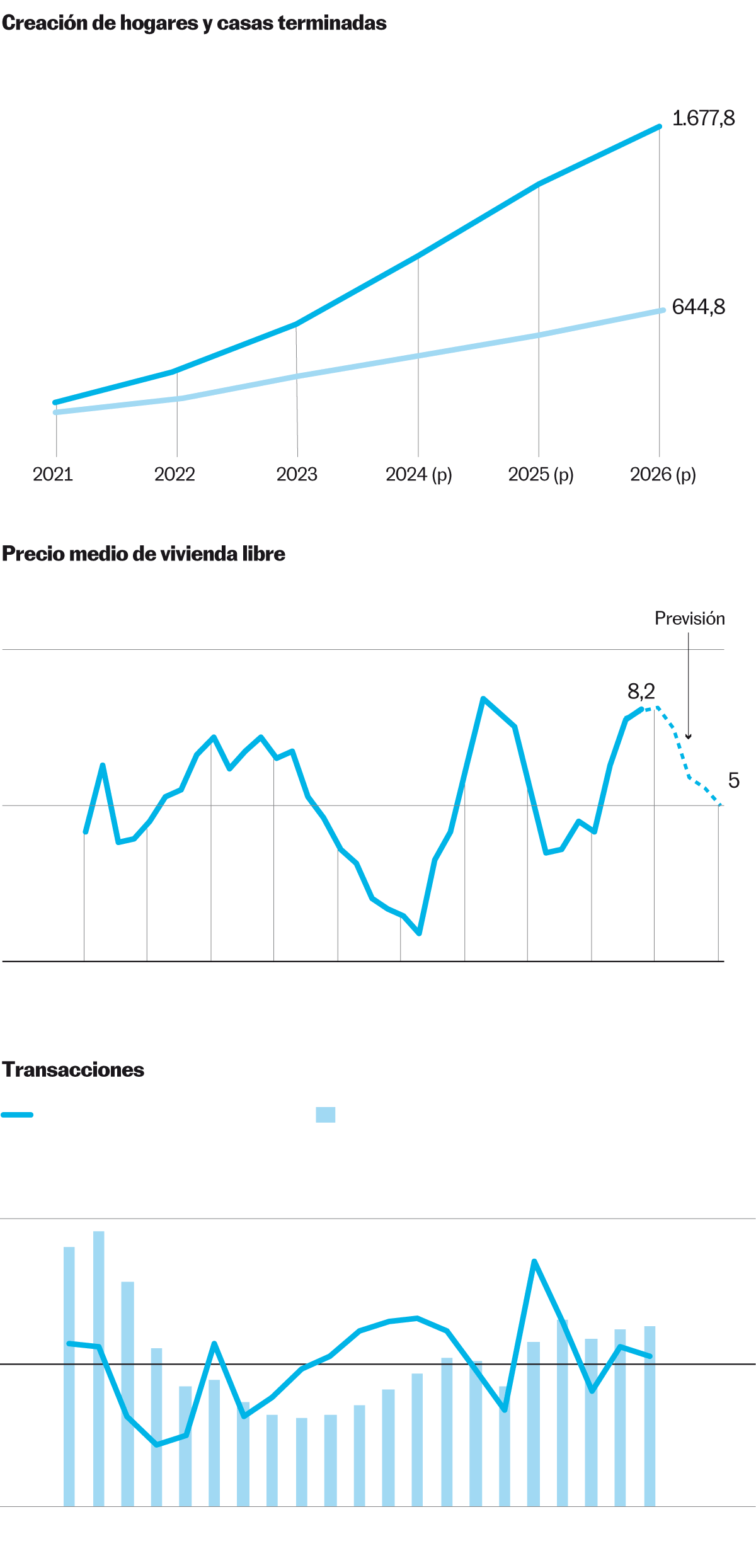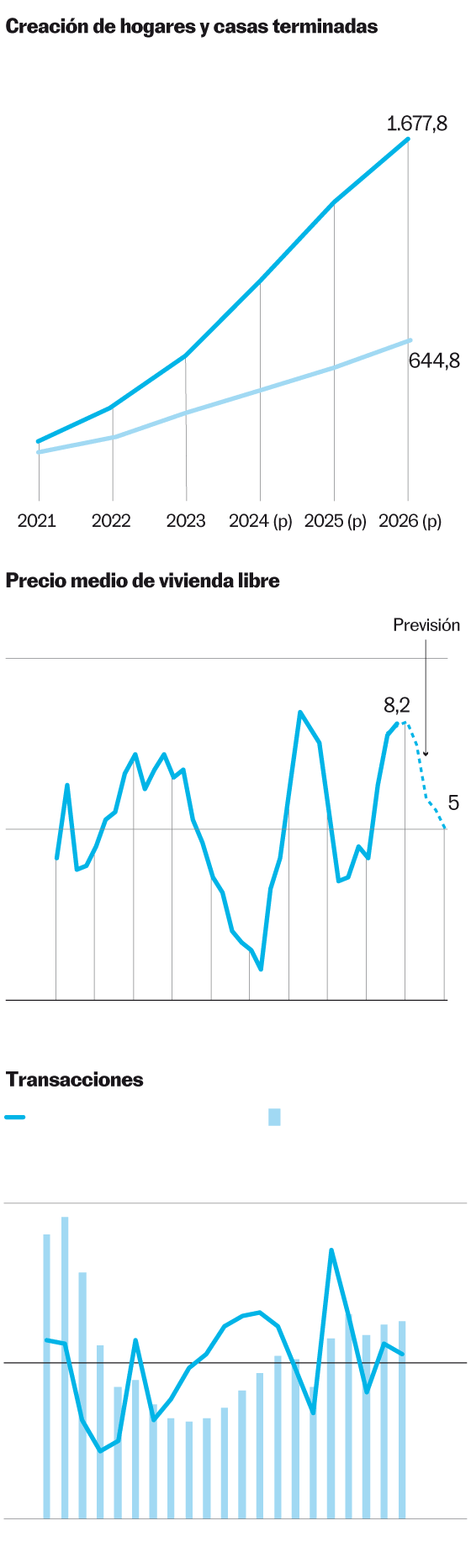 Esto supone un reto para la economía. Palabras mayores. “La escasez de vivienda restringe la mejora en la calidad de vida y puede entorpecer la inmigración, lo que resulta preocupante ante la caída de la población activa de nacionalidad española”, avisan en BBVA Research, que calcula que para 2026 el déficit alcanzará el millón de casas. No obstante, parece que algo empieza a moverse. El número de visados ha pasado de un promedio mensual de 9.125 en 2023 a 10.550 en los primeros nueve meses de 2024. “Este año acabaremos con unas 110.000 viviendas nuevas terminadas y en 2025 crecerán entre el 10% y el 15%, pero deberíamos estar construyendo 250.000 unidades al año mínimo”, comenta Xavier Vilajoana, presidente de la Asociación de Promotores y Constructores de España. No es suficiente, porque el proceso de producción de inmuebles es de ciclo largo. “La vivienda nueva que se haga ahora se verá en 2026 y en 2027″, dice Vilajoana.