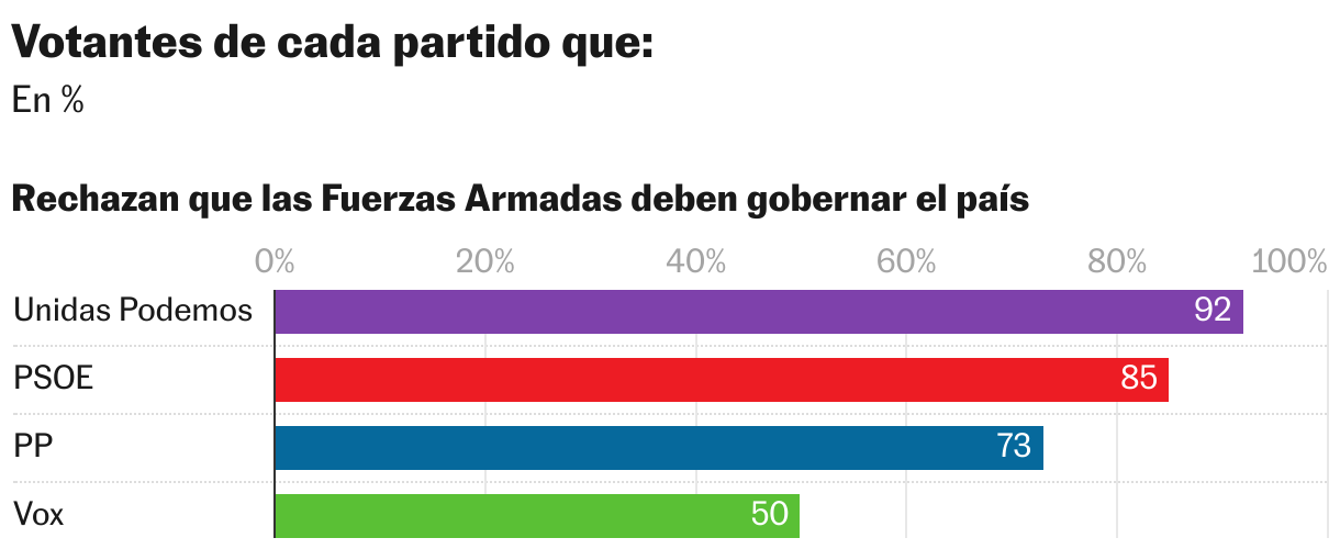El segundo factor que cita Rodríguez López-Brea es que las bases conservadoras podrían no ser tan permeables como se suele dar por hecho al discurso sobre la democracia en riesgo que suele emplearse contra Trump. Con datos del CIS de 2024, más de la mitad de los votantes del PP (59,2%) y Vox (53,9%) cree que el Estado debe garantizar “la seguridad y el orden” incluso limitando “derechos y libertades”, porcentajes superiores a los de los votantes del PSOE (42,7%) y Sumar (27,5%), si bien los resultados podrían estar marcados por la reciente experiencia del covid.