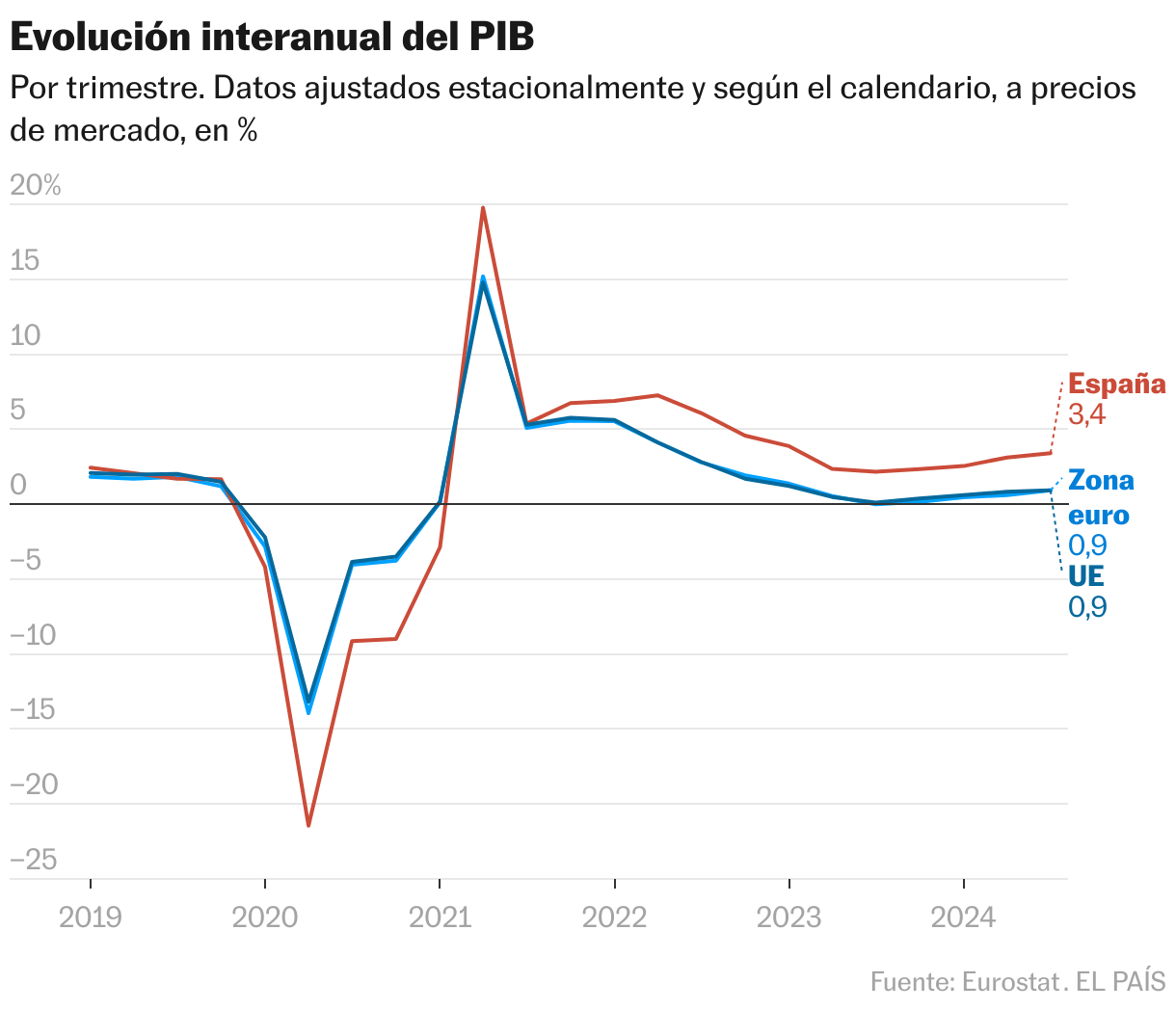 La economía española continúa mostrando una fortaleza inusitada. Según el avance publicado este miércoles por el INE, el producto interior bruto avanzó un 0,8% trimestral entre julio y septiembre. El PIB encadena cinco trimestres consecutivos con tasas de crecimiento del 0,7% o superiores. En tasa interanual, la economía se acelera dos décimas y crece al 3,4% a pesar de un contexto de debilidad de sus socios europeos, empujada por los aumentos de la población inmigrante, el turismo, las exportaciones de servicios empresariales, el consumo público, una mayor resistencia de la industria española y una moderación de los precios.