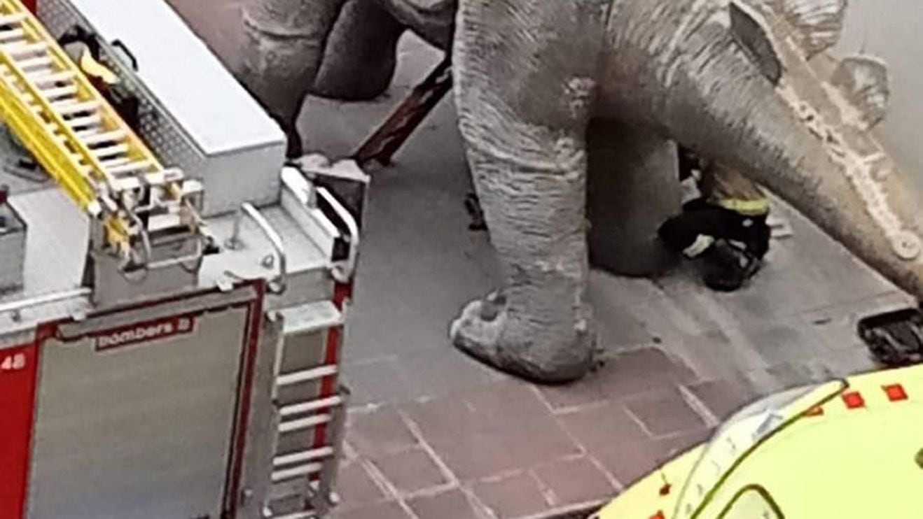 A la mañana siguiente, unos niños que jugaban frente al hotel alertaron de que salía un pie humano de la figura y avisaron a emergencias. La policía comprobó que había una persona atrapada en el interior del dinosaurio, en una de las patas, y hubo primero que serrar la estructura y posteriormente extraer el cuerpo con un camión-grúa debido al elevado peso de la víctima y su altura. El hombre se coló voluntariamente, alega el Ayuntamiento, dentro de una de las piezas de la figura, y se colocó en posición invertida para coger su teléfono móvil que se cayó en el interior, según la hipótesis de los Mossos. Luego quedó atrapado, en un lugar que mide 50 centímetros en el exterior, pero disminuye hasta los 40, y falleció debido a una broncoaspiración alimentaria derivada de una compresión torácica posicional.