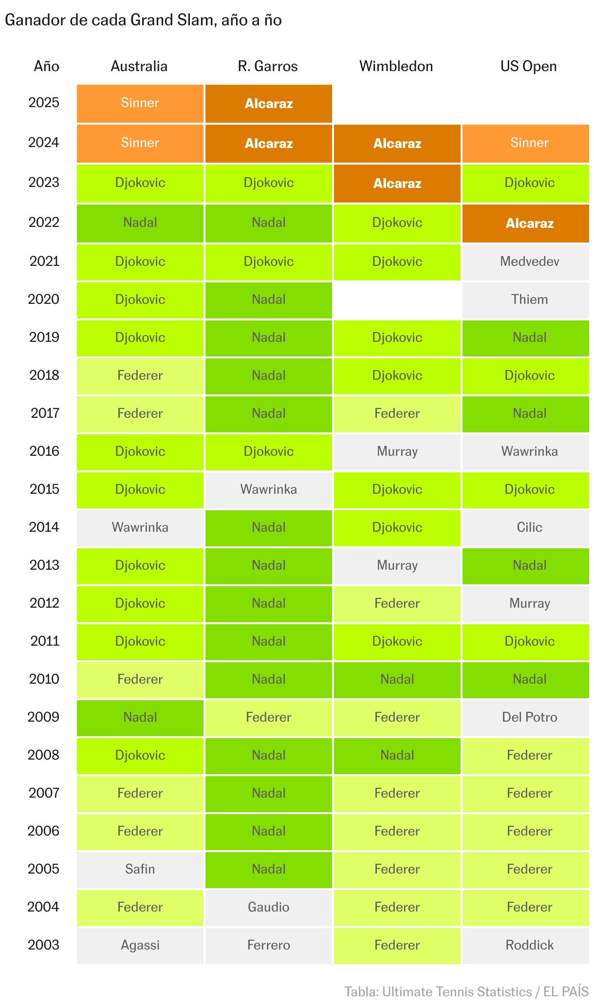 Alcaraz conquistó su primer Grand Slam en Nueva York 2022, pero es desde 2024 cuando la nueva generación se consolida definitivamente. Entre Alcaraz y Sinner ya encadenan seis Grand Slams consecutivos. La vieja guardia ha cedido el testigo: Federer y Nadal están retirados, y Djokovic no gana un grande desde 2023.