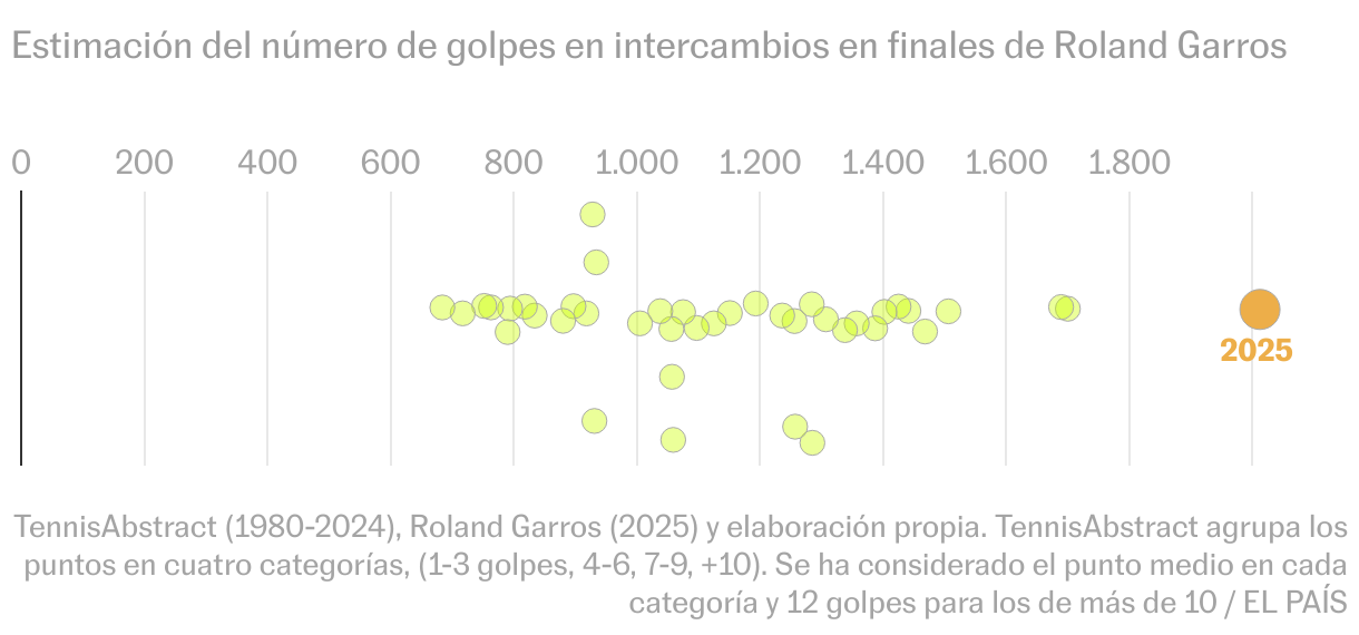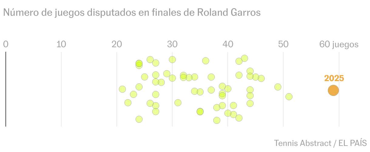 El récord casi duplica la duración media de las finales parisinas, que en la era Open ronda las tres horas. Y quintuplica las más breves —de 1970, 1973 y 1975— que apenas llegaron a hora y media.