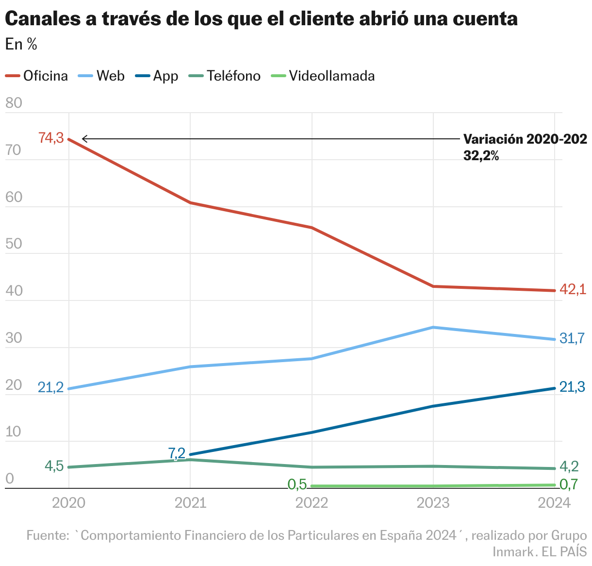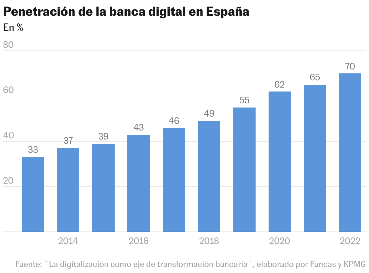 Los datos son claros. En apenas nueve años, la penetración de la banca digital en España ha pasado de representar un 33% al 70% actual. Y la previsión es que en los próximos cinco años alcance el 85%, según Funcas. Las entidades aspiran a que antes de 2030 tres de cada cuatro contrataciones de productos financieros se hagan online, por lo que el negocio se ha traslado a las webs y especialmente a las aplicaciones para el móvil.
