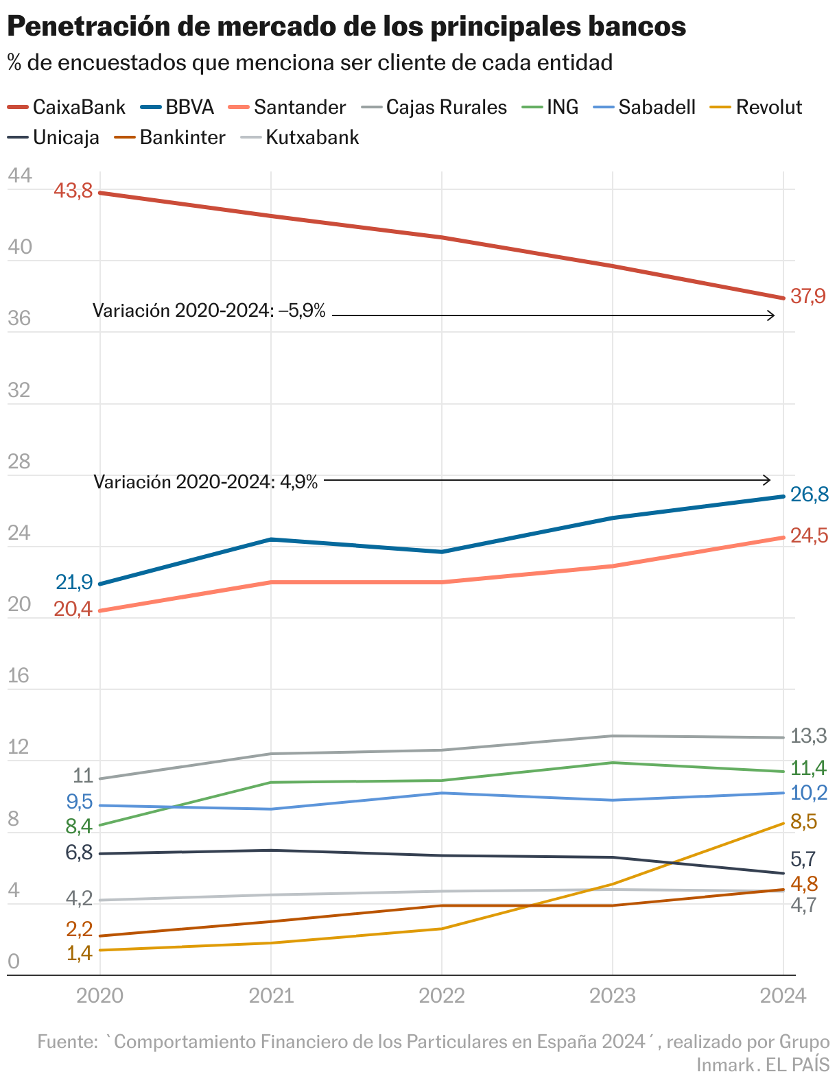 Según un estudio que realiza cada año Grupo Inmark, los grandes bancos —CaixaBank, BBVA y Santander— son los que tienen una mayor cuota de clientes en España, con mucha diferencia respecto al resto (ver gráfico). Se trata de entidades con un fuerte arraigo, que conocen a sus clientes y que ofrecen toda la gama de productos financieros, tanto para particulares como para empresas. Pero el estudio también refleja que los neobancos están ganando terreno. Desde 2020, Revolut es la entidad que más crece (si antes solo el 1,4% de los clientes afirmaba ser usuario de la entidad, actualmente el 8,5% reconocer tener una cuenta en el neobanco). Igualmente, es el banco que más nuevos clientes logra captar (uno de cada cinco, el 20% de las nuevas altas). Y otros bancos digitales como Imagin (4,4%), N26 (3,2%) u Openbank (2,1% están captando más nuevos clientes que algunas de las principales entidades tradicionales.