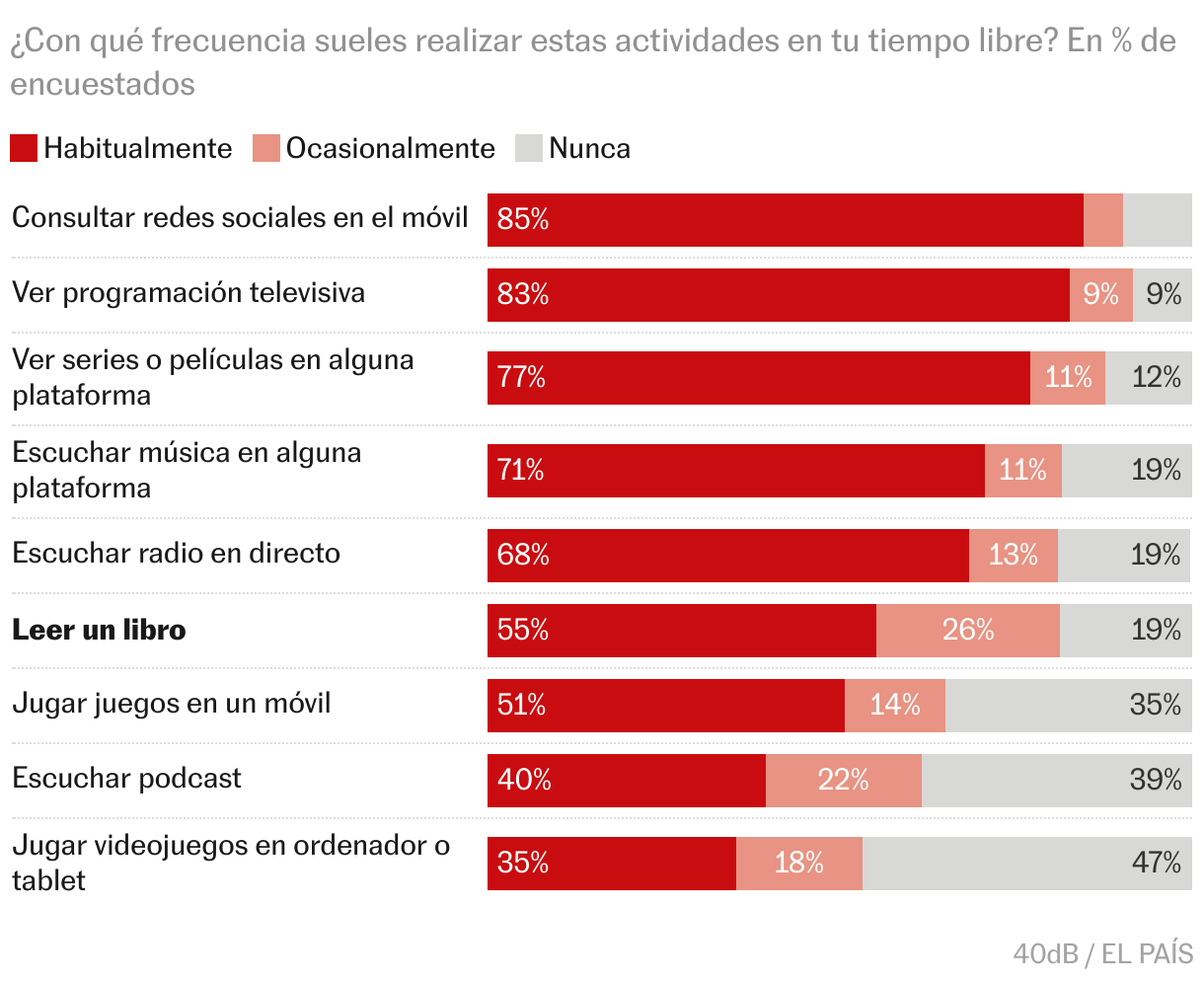 La lectura es más popular que los videojuegos o los podcasts, aunque sí se ha visto superada por otras formas de ocio digital: el 71% de los entrevistados escucha música en una plataforma habitualmente, el 77% ve películas o series por streaming, y casi todos, el 85%, se entretiene mirando sus redes sociales desde el móvil. Esa última actividad ha superado hasta a la televisión (83%), que durante décadas ha sido el entretenimiento de masas.