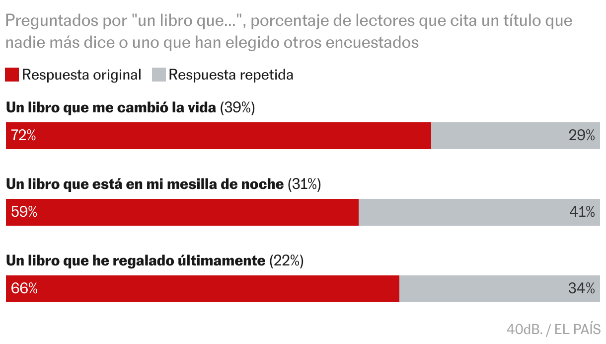 La encuesta incluía tres preguntas de respuesta libre, donde los entrevistados podían citar libros españoles concretos: se les preguntó qué obras les han cambiado la vida, cuáles han regalado recientemente y que tienen en la mesita de noche. Pero sus respuestas dibujan un patrón más general: ¡leemos muchos libros distintos! De hecho, la mayoría de la gente citó una obra que nadie más había citado. Por ejemplo, el 72% de la gente que mencionó un libro relevante en su vida escogió un volumen que no repitió ningún otro encuestado.