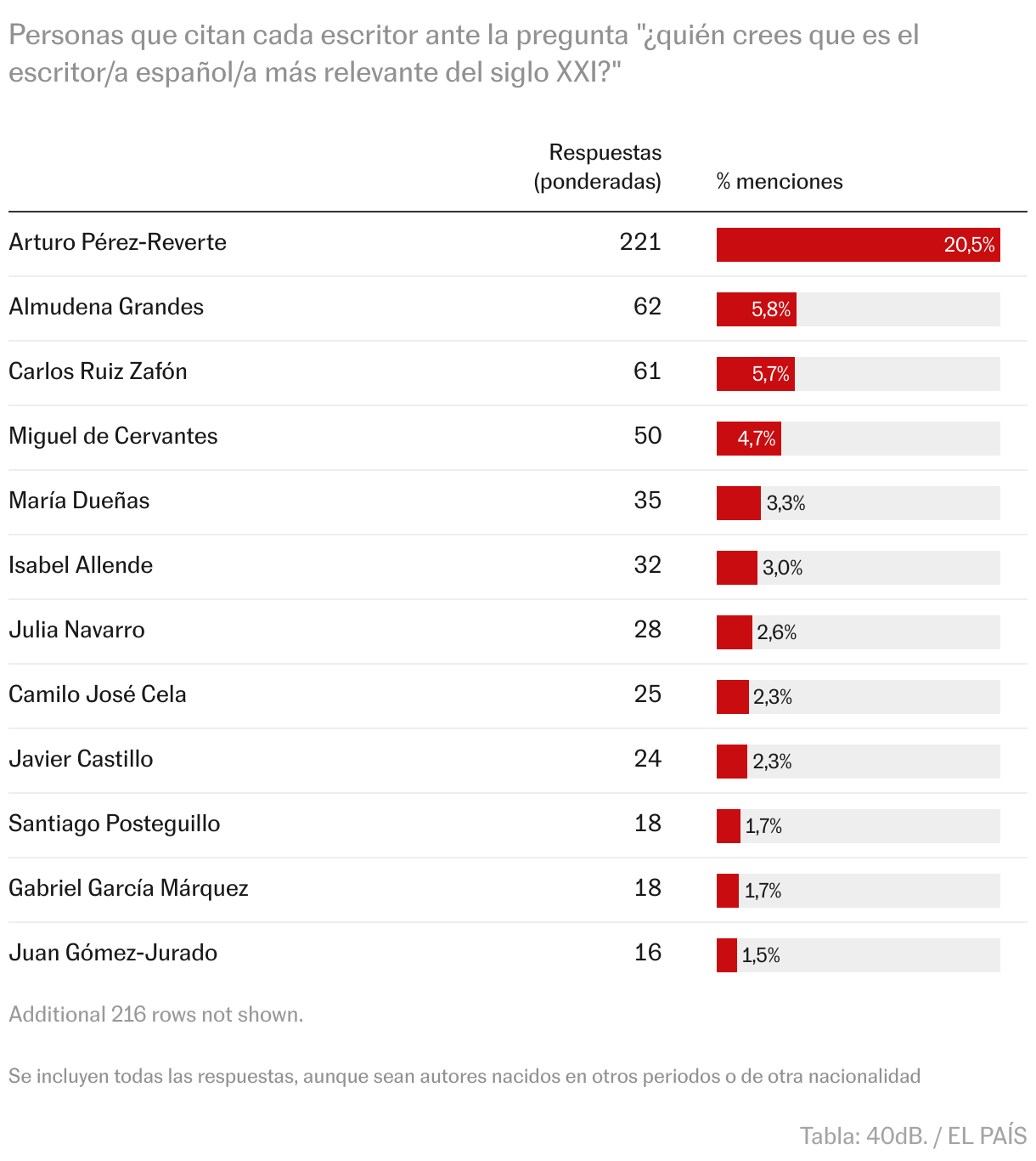 Es divertido comprobar que en esta lista se cuelan respuestas de lectores despistados, como los que señalan a Miguel de Cervantes (5%) como el escritor español más relevante de este siglo, o los que eligen a Isabel Allende (3%) o a Gabriel García Márquez (3%), que no tienen esa nacionalidad. También es evidente el sesgo de género: el 42% de las mujeres escogió a una escritora como gran figura, pero solo el 20% de los hombres hizo lo mismo.