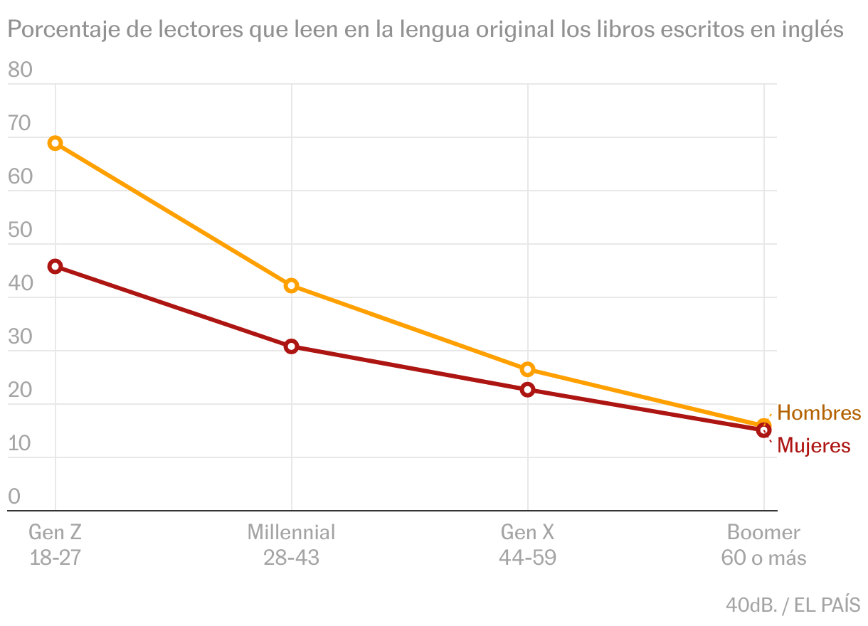 Los idiomas reflejan un gigantesco cambio generacional: más del 55% de los jóvenes de 18-27 años lee libros en inglés, frente apenas el 15% de la generación de sus abuelos. Es una de esas transformaciones que nos pasan desapercibidas. La globalización e internet ha convertido en masivo algo que hace no tantos años era una posibilidad absolutamente elitista.