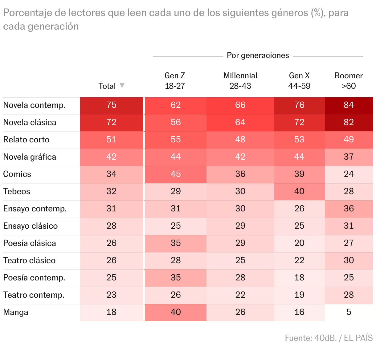Los jóvenes de la generación Z son los más eclécticos en cuanto a géneros. Entre ellos, son tantos los que leen cómics (45%) como los que leen novelas clásicas (56%); muchos consumen manga —cómic japonés— (40%), pero también poesía (35%). Este último caso es curioso: la poesía es un gusto que comparten los Z y los boomers, los más jóvenes y los más mayores. Además, es gracioso que haya más lectores de “tebeos” en la generación X: ellos los llaman así.