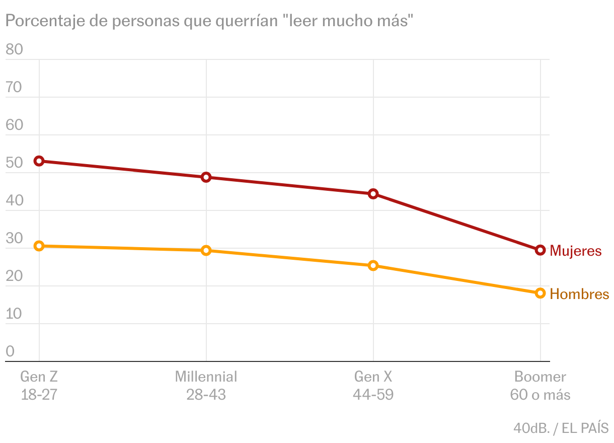El 73% de la gente querría dedicar más tiempo a la lectura y un 33% querría leer “mucho más”. Son sobre todo mujeres, y más jóvenes. La mitad de las mujeres de 18-27 años querrían leer mucho más.