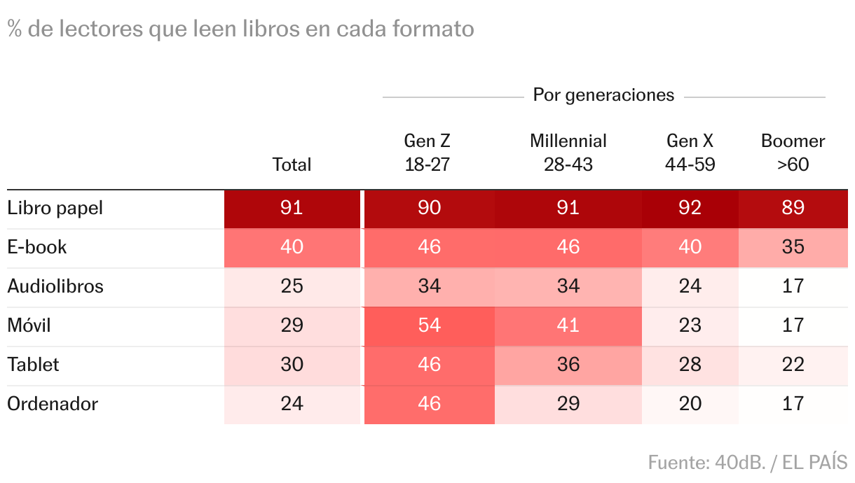 El 90% de los lectores siguen leyendo en papel, pero los nuevos dispositivos han abierto una brecha por edad. Entre los lectores de menos de 40 años, son prácticamente la mitad lo que también leen libros en un e-book o en el móvil.