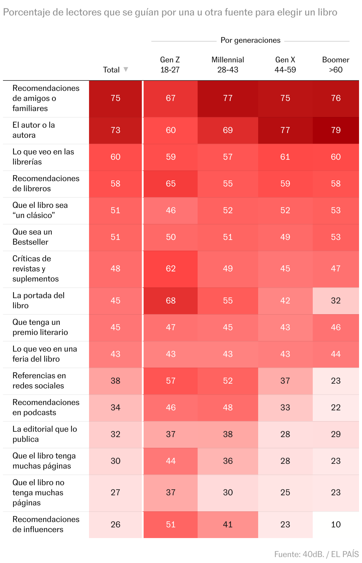 A la hora de escoger qué libros leer, nos influyen cosas evidentes como la temática o el autor, pero también las recomendaciones de amigos o libreros. De nuevo, las diferencias por edades son muy claras. Los jóvenes buscan más referencias fuera de sus círculos: en un podcast (46%), a través de influencers (51%) y en sus redes sociales (57%), pero también son los que más mencionan la utilidad de revistas y suplementos culturales (62%). Otra brecha por edad nos llamó la atención: muchos jóvenes eligen un libro porque tiene muchas páginas, casi celebrándolo.