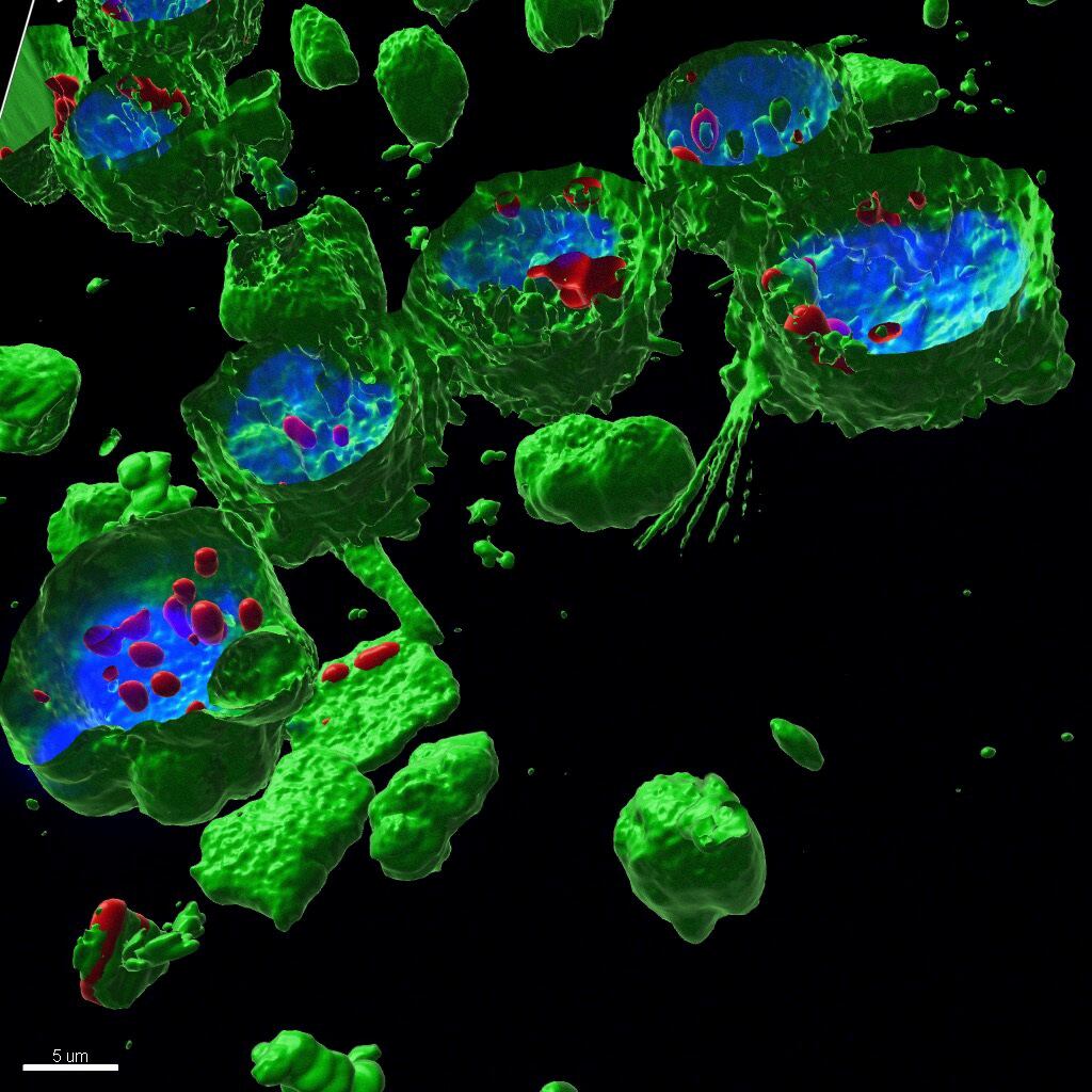 Podría tomarse por un cuadro abstracto, pero se trata de una imagen realista en la que aparecen células humanas colonizadas por microplásticos (los puntos en rojo). El plástico, al degradarse, se convierte en una suerte de polvo de harina que lo inunda todo, de modo que respiramos plástico, comemos plástico y bebemos un plástico que, de tan atomizado, es capaz de atravesar las barreras defensivas de los órganos. El asunto viene preocupando desde hace algún tiempo a la ciencia porque tal ingestión implica que acumulamos plástico en el sistema digestivo, en los pulmones, en la placenta, en la sangre y en el corazón, además de en el cerebro.