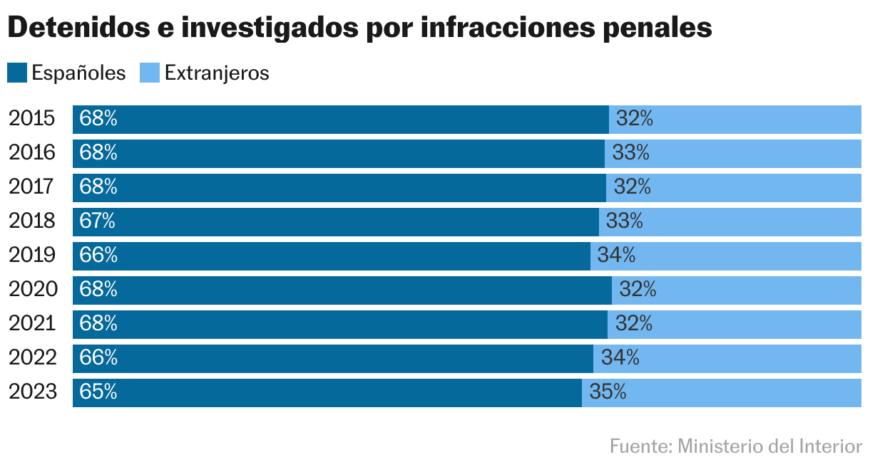 En los últimos nueve años, el porcentaje de personas españolas y extranjeras (incluidos ciudadanos comunitarios) detenidas o investigadas por infracciones penales ha permanecido estable, según los datos de Interior. Que los ciudadanos extranjeros estén implicados en una media del 33% de los casos policiales es un ejemplo de esa sobrerrepresentación, según los expertos, que recuerdan otros elementos ya citados, como la especial focalización de la policía sobre ciertos colectivos o que no todos los procedimientos siguen finalmente adelante.