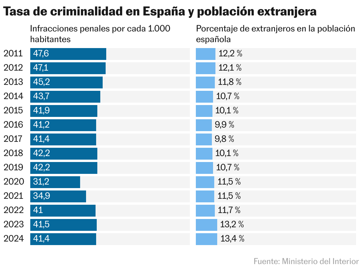 El equipo de coordinación y estudios del Ministerio, que realiza los balances de criminalidad, ha comparado esta última tasa con las cifras de extranjeros en España (que no distinguen entre comunitarios y no comunitarios) y ha concluido que “el fenómeno de la inmigración no está teniendo un impacto negativo ni significativo sobre la criminalidad”, según fuentes del departamento de Fernando Grande-Marlaska. La población extranjera se encuentra en estos momentos en un 13,4%, según estas cifras.