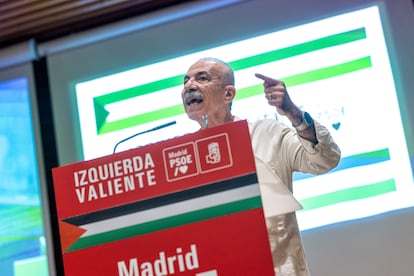 “Genocidio”. “Violencia”. “Sangre derramada de cientos de miles de palestinos”. “El pueblo de Madrid está con Palestina”. Las palabras del vídeo con el que el PSOE abre el acto de este sábado resuenan con la fuerza de una denuncia. El embajador llega rodeado por la plana mayor del partido en la región. Le espera un atril decorado con la bandera palestina, el lema “Izquierda Valiente” y las siglas del PSOE. Sube, y arranca.