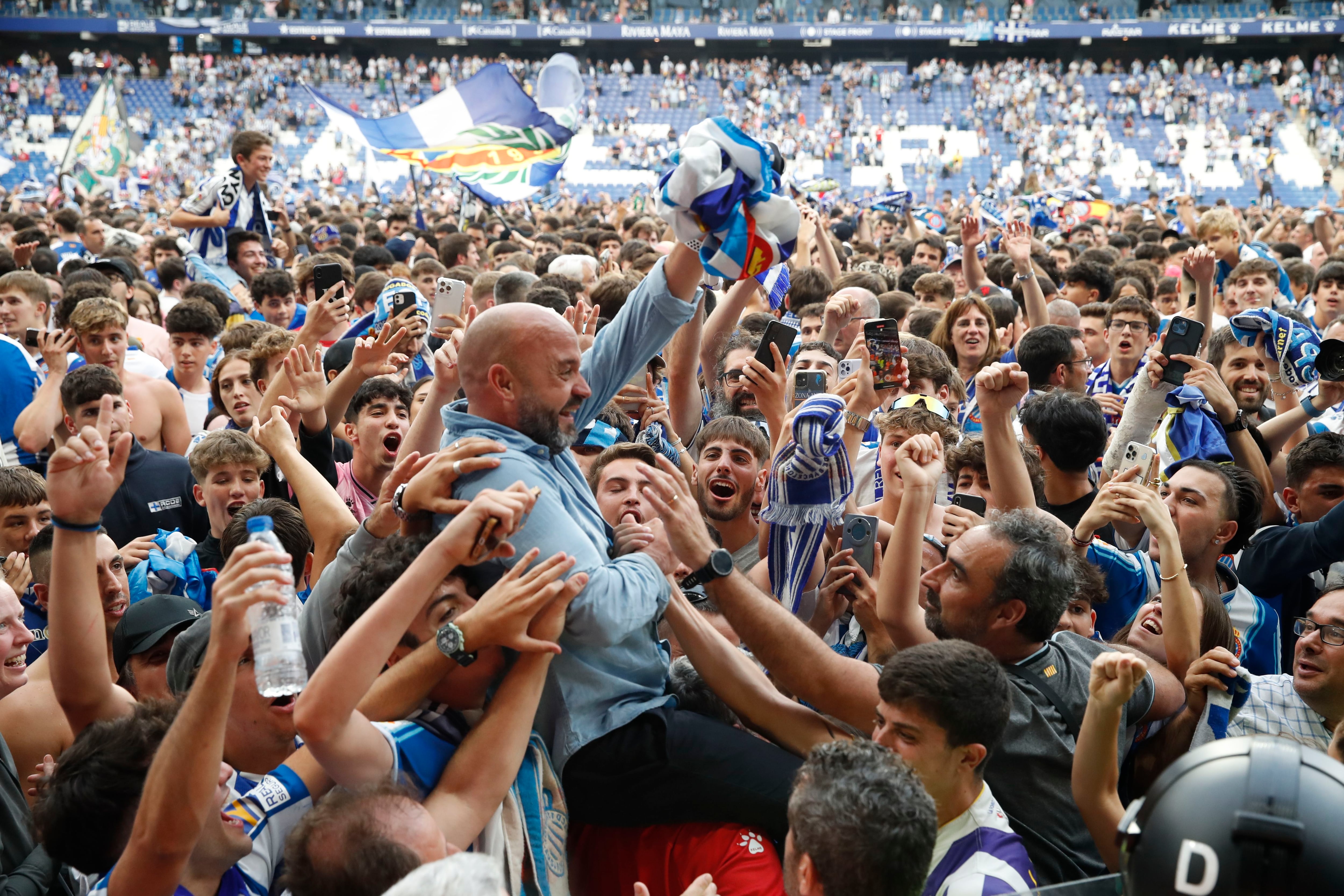 Costó sudores sofocar el fanatismo, al punto de que los jugadores no regresaron de inicio al césped como estaba estipulado para participar en comunión de los festejos y la algarabía, de un ascenso necesario para la supervivencia del club. Pero sí que fueron al palco, ya con el estadio casi vacío, para participar de la felicidad común. “Hemos luchado, hemos vuelto”, se leía en las camisetas que se pusieron los futbolistas para el festejo, aunque desde el club dijeron que no había nada previsto para no gafar la tentativa. Pasados los minutos, ya casi sin gente en las gradas, sí que regresaron al césped, algunos con cerveza en la mano y otros sin camiseta, como era el caso del técnico, que no tenía freno para la felicidad, que se ganaba las risas de sus jugadores. Aunque ninguno más feliz que Puado, el centro de las canciones periquitas. Un festival, un alivio. Aunque también momento, por extraño que parezca, para sacar facturas pendientes. “No sé si seguiré. El club me hizo una oferta de renovación hace unos días, pero fue una falta de respeto. No confían en mí”, resolvió Braithwaite, Pichichi de Segunda con 22 tantos; “he trabajado duro para dejar al Espanyol en Primera y ahora estoy libre. Veremos qué pasa en los próximos días”. La afición fue diáfana: “¡Martin quédate, Martin quédate, Martin quédateeee!”, le cantaron con devoción.